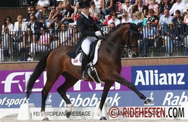 Mesterskabets allerførste ekvipage på banen var Pernille Teidor Olesen og Don Dino e. Don Cardinale / Placido, der i dag opnåede 65,211%. Mille Larsen Warncke og Lankjærgaard's Donna Fetti e. Blue Hors Don Schufro / World Cup I (opdr. Jens og Marianne Søndergaard) fik af dommerne deres ridt belømmet med 68,237%. Det har bragt Danmark på sjettepladsen, mens føringen er indtaget af Tyskland efterfulgt af Holland, Sverige, Belgien og England.