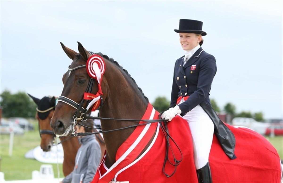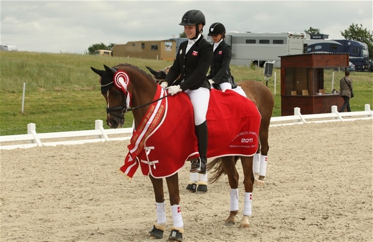 De danske ponyryttere lagde stilen fra starten ved at besætte de fire første pladser i den første individuelle dressurkonkurrence ved dette års nordiske mesterskab. Og ikke nok med at de danske piger alle placerede sig i toppen - de leverede også allesammen flotte ridt, der alle blev honoreret til over 70%. Vinder af klassen, og dermed Nordisk Mester, blev Maya Jørgensen og Modderbeek's Flo, der scorede 70,816%. Caroline B. Smidt og Campari W blev nr. 2 med 70,582%, Victoria E. Vallentin og Natalina blev nr. 3 med 70,424% og Caroline Aarosin og SL Lucci blev nr. 4 med 70,290%. Det var forståeligt nok en flok stolte forældre og en mindst lige så stolt landstræner, Vibeke Degn Andersen og holdleder Rigmor Kristensen, der efterfølgende kunne fejre triumfen med champagne i Middelfart Ridecenters imponerende, restaurantlignende rytterstue. Også juniorrytterne red deres første individuelle konkurrencer i dag, og juniorholdet gjorde stort set ponyrytterne kunsten efter. Klassen blev vundet af en suveræn Nanna Skodborg Merrald på Milibar, der scorede 72,210% og et Nordisk Mesterskab. Svenske Marina Mattsson og Beckham blev 2'er med 69,418%, og derefter stod der Danmark på de øvrige placeringer, da Anna Zibrandtsen og Capriciella delte 3. pladsen med Nanna Bronnée Madsen/Skjoldsgaard Monté Vo - begge ekvipager scorede 68,736% og Kathrine Sumborg Christensen blev nr. 5 med Rohmario, der fik 67,186%. Se alle resultater via link til højre.