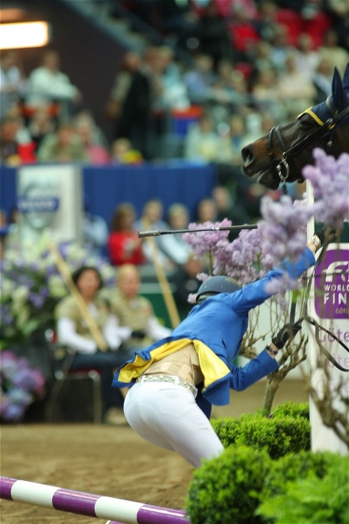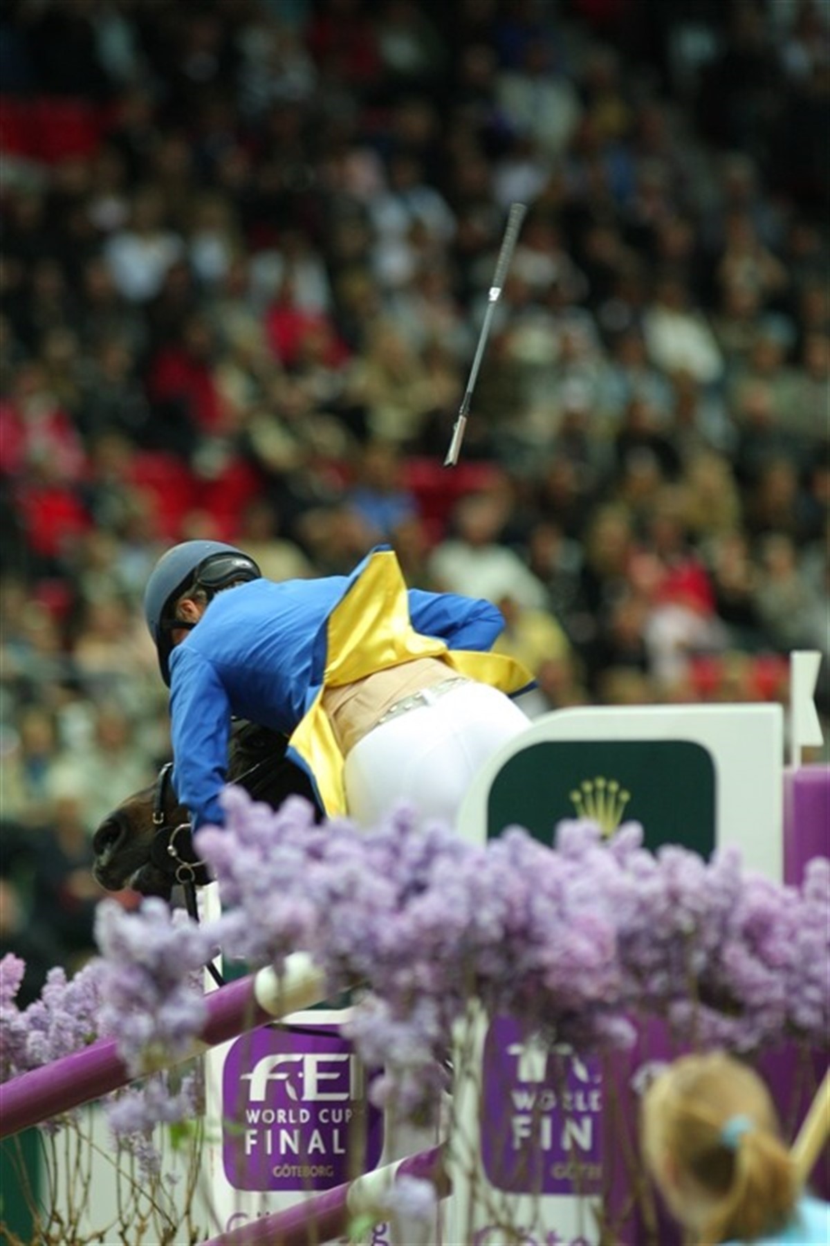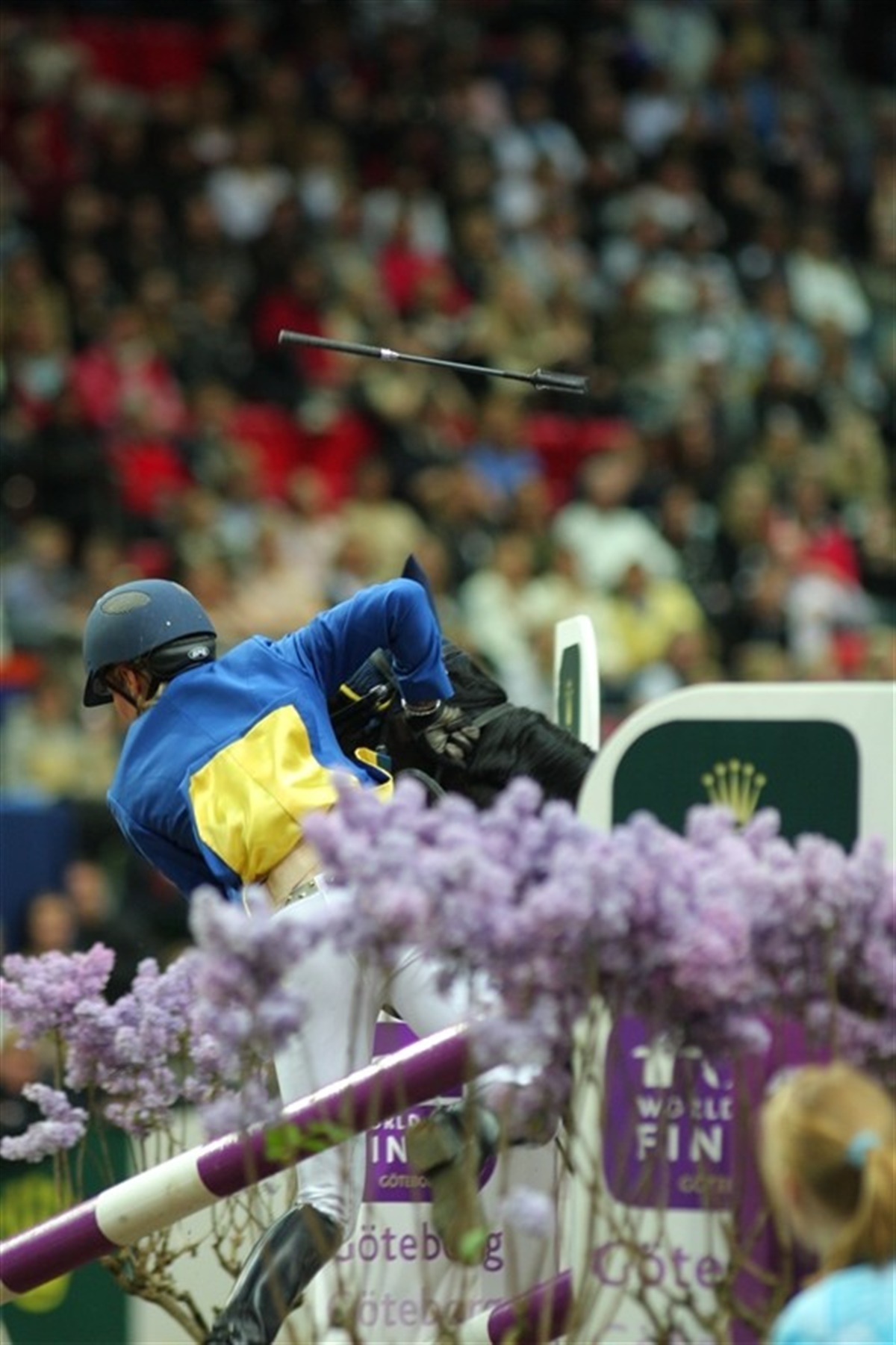 Rytterne satser alt for at få en topplacering i klasserne i Göteborg, ikke alene er det kampen om æren, berømmelsen og points til verdensranglisten - det drejer sig naturligvis også om at få del i de gode præmiepenge, som arrangørerne har udsat i alle klasser. Judy-Ann Melchior fra Belgien var en af ialt 7 ryttere i omspringningen i Grand Prix-klassen i aftes. Der var 175.000 skr. til vinderen så den belgiske rytter gav den gas på Grande Dame Z, men den satsning var den sorte hoppe ikke helt med på. Hun bremsede hårdt foran en stor lodret, og så forlod rytteren sadlen. På billedserien fra styrtet ser man rytterens pisk flyve højt op i luften over ekvipagen, og rytteren sætte sig elegant på bagen.