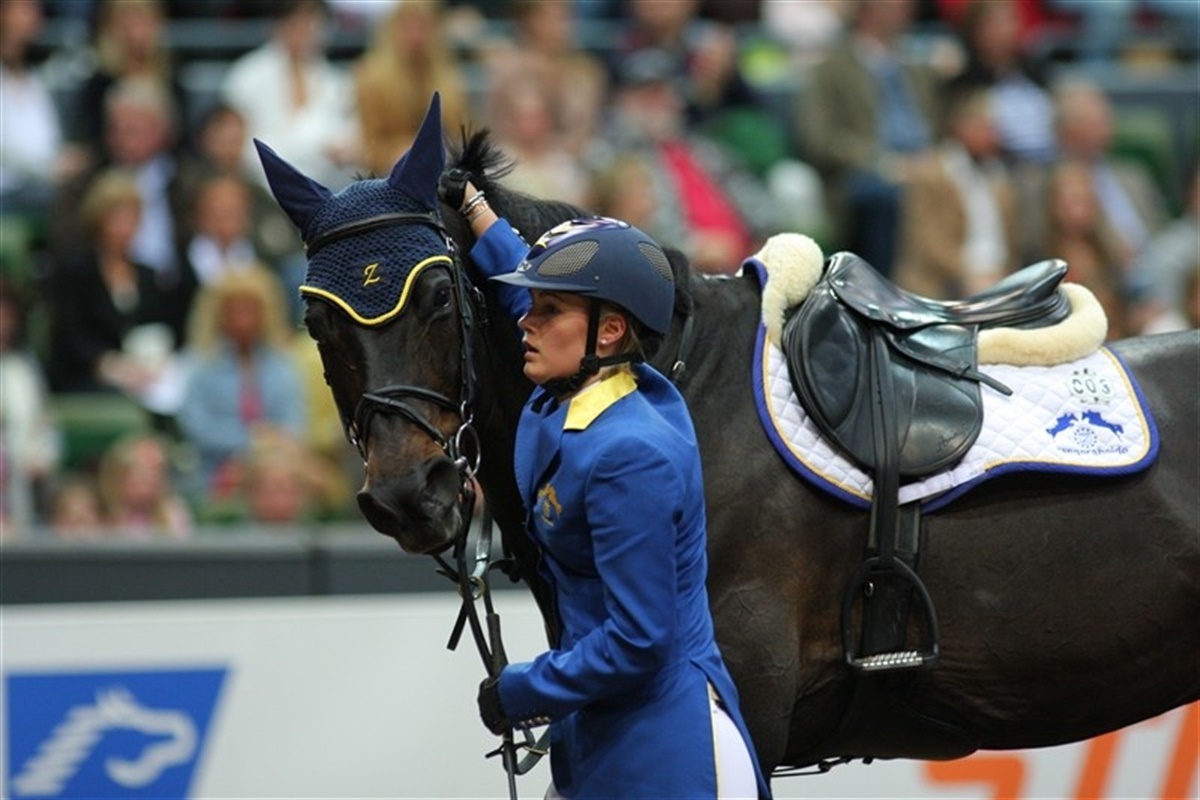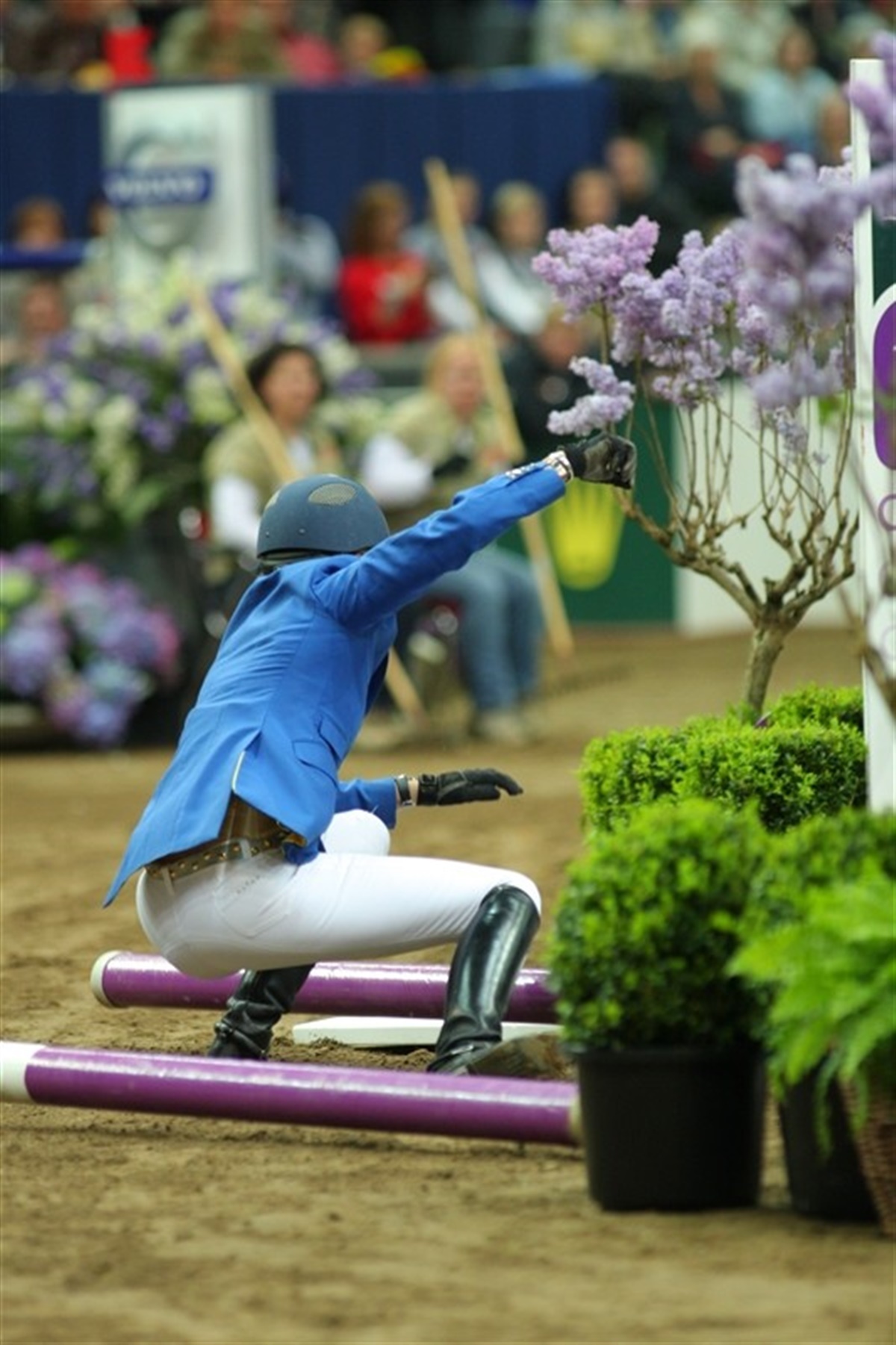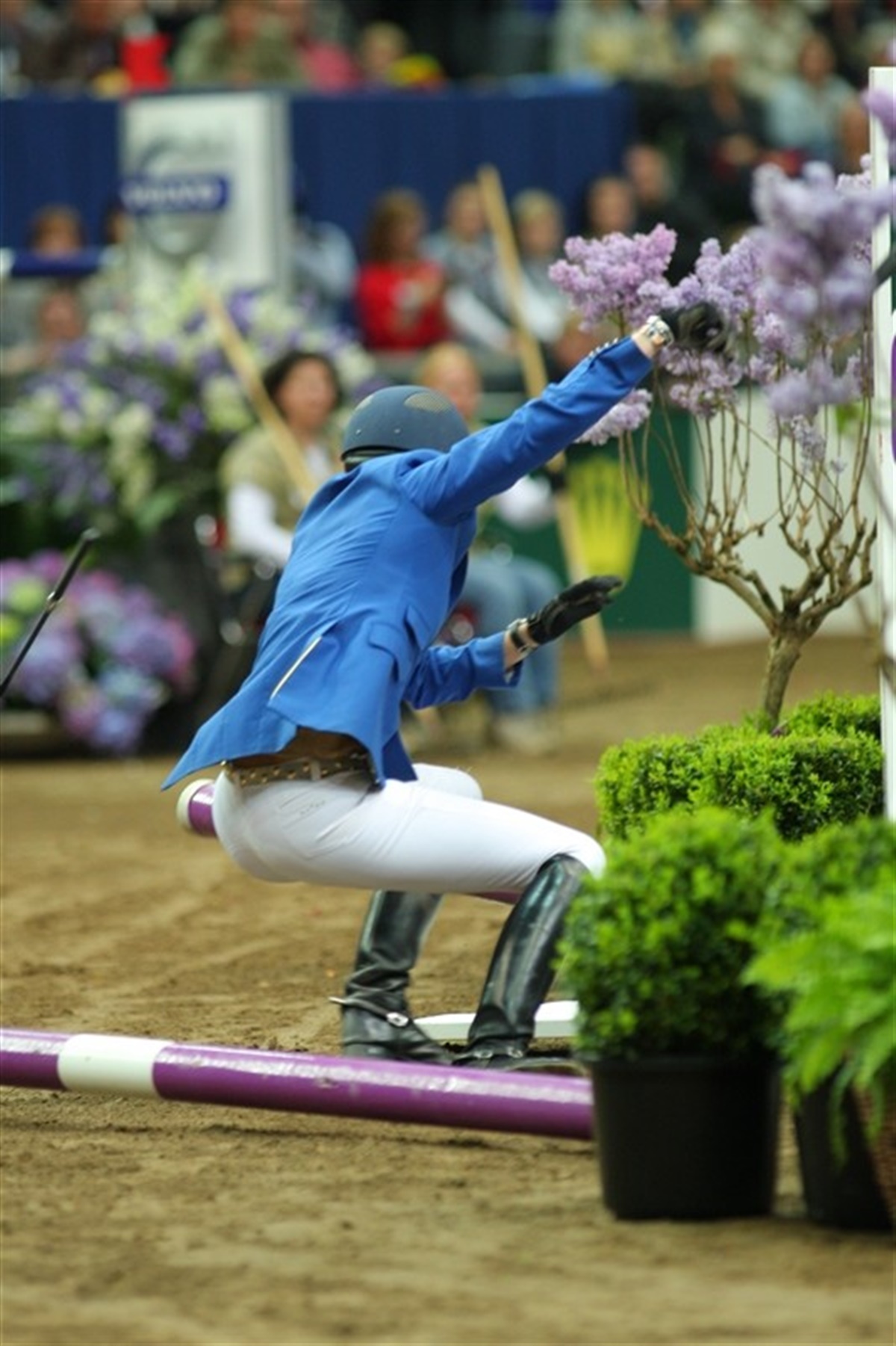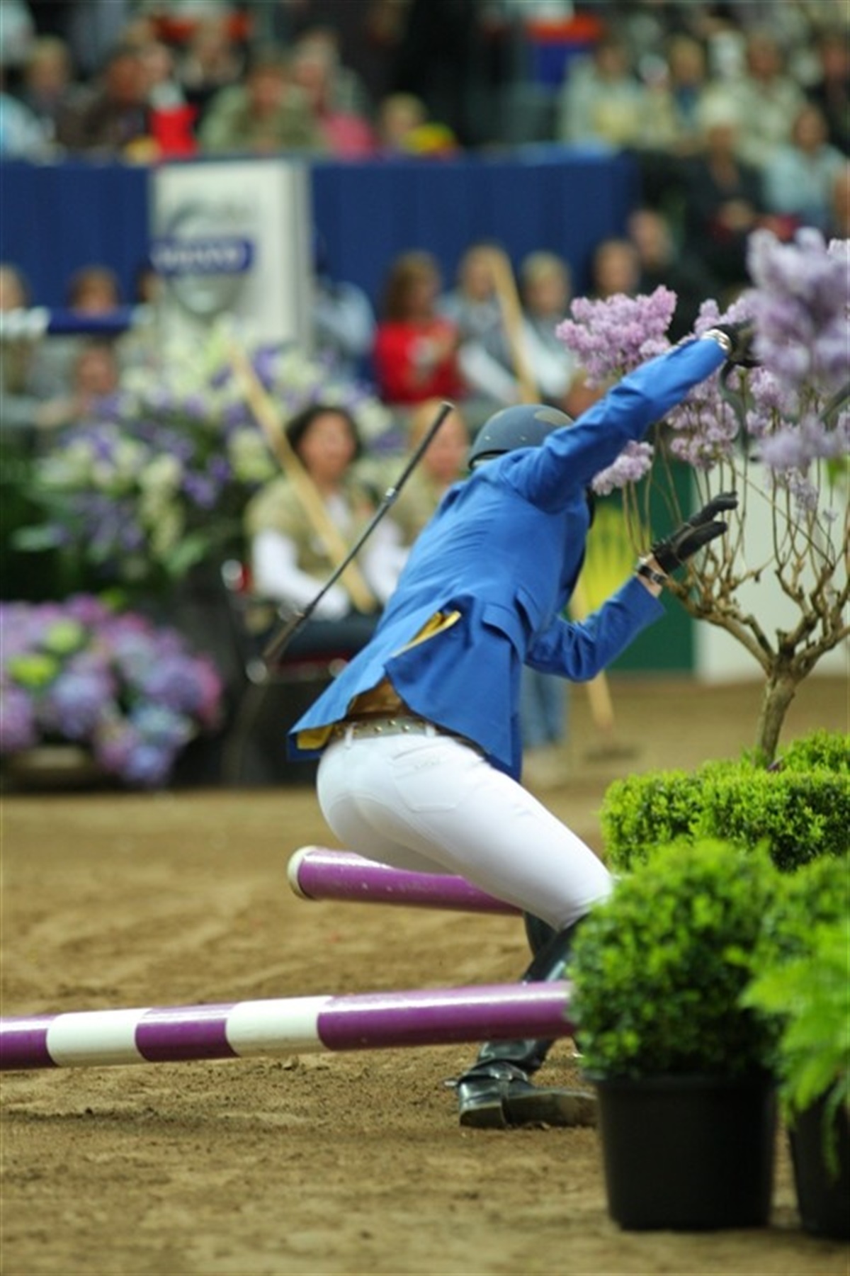 Rytterne satser alt for at få en topplacering i klasserne i Göteborg, ikke alene er det kampen om æren, berømmelsen og points til verdensranglisten - det drejer sig naturligvis også om at få del i de gode præmiepenge, som arrangørerne har udsat i alle klasser. Judy-Ann Melchior fra Belgien var en af ialt 7 ryttere i omspringningen i Grand Prix-klassen i aftes. Der var 175.000 skr. til vinderen så den belgiske rytter gav den gas på Grande Dame Z, men den satsning var den sorte hoppe ikke helt med på. Hun bremsede hårdt foran en stor lodret, og så forlod rytteren sadlen. På billedserien fra styrtet ser man rytterens pisk flyve højt op i luften over ekvipagen, og rytteren sætte sig elegant på bagen.