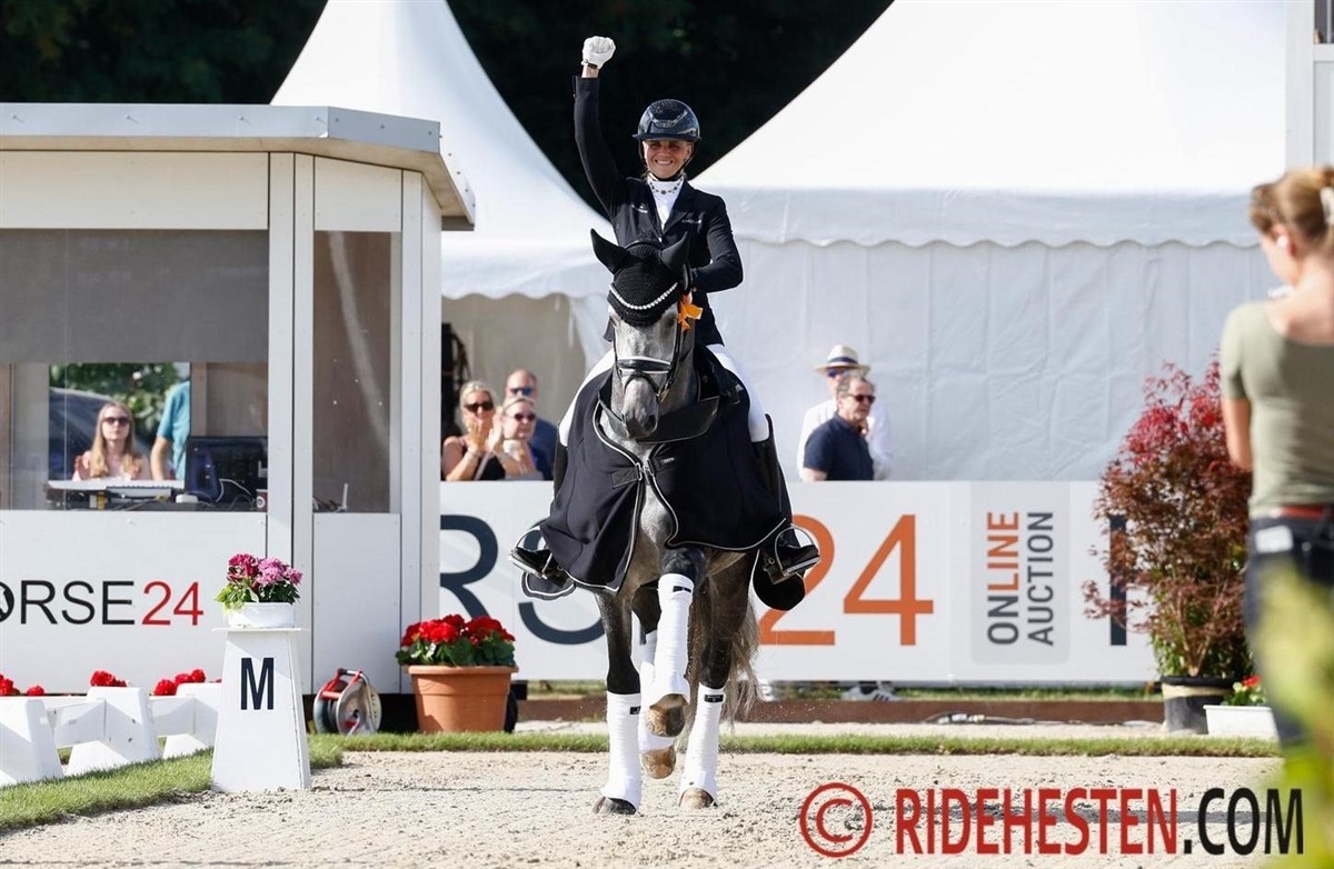 Mette Sejbjerg Jensen smilede forståeligt nok over hele femøren, da hun fremviste Helgstrand Dressages KWPN-hingst, Proud James e. Jameson RS2/ Johnson under hollandsk flag. Sikke en hest og sikke et ridt! Den smukke, skimlede hingst dansede derudaf i både trav og galop og viste skridt med enorm overtrædning. Der var lidt småspændinger hist og her, og desværre begyndte publikum at klappen, inden Mette havde hilst af, så hingsten blev forskrækket. Hun fik hold på ham, og dommerne valgte at se bort fra den lille hændelse.