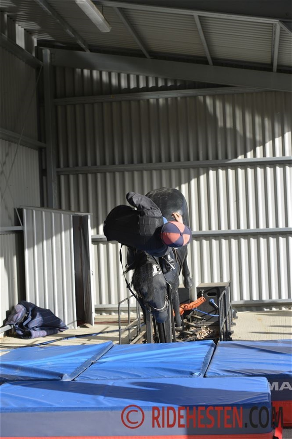 I England er der en uddannelse for fremtidige jockeys på "The British Racing School" i Newmarket. Ridehesten var på besøg på stedet i november 2012, hvor en af skolens trænere demonstrerede, hvodan de lærer rytterne de rette faldteknikker bl.a. ved brug af en mekanisk hest. Statistikker viser nemlig, at jockeyer, der rider steplechase, falder af i hvert 16. løb.