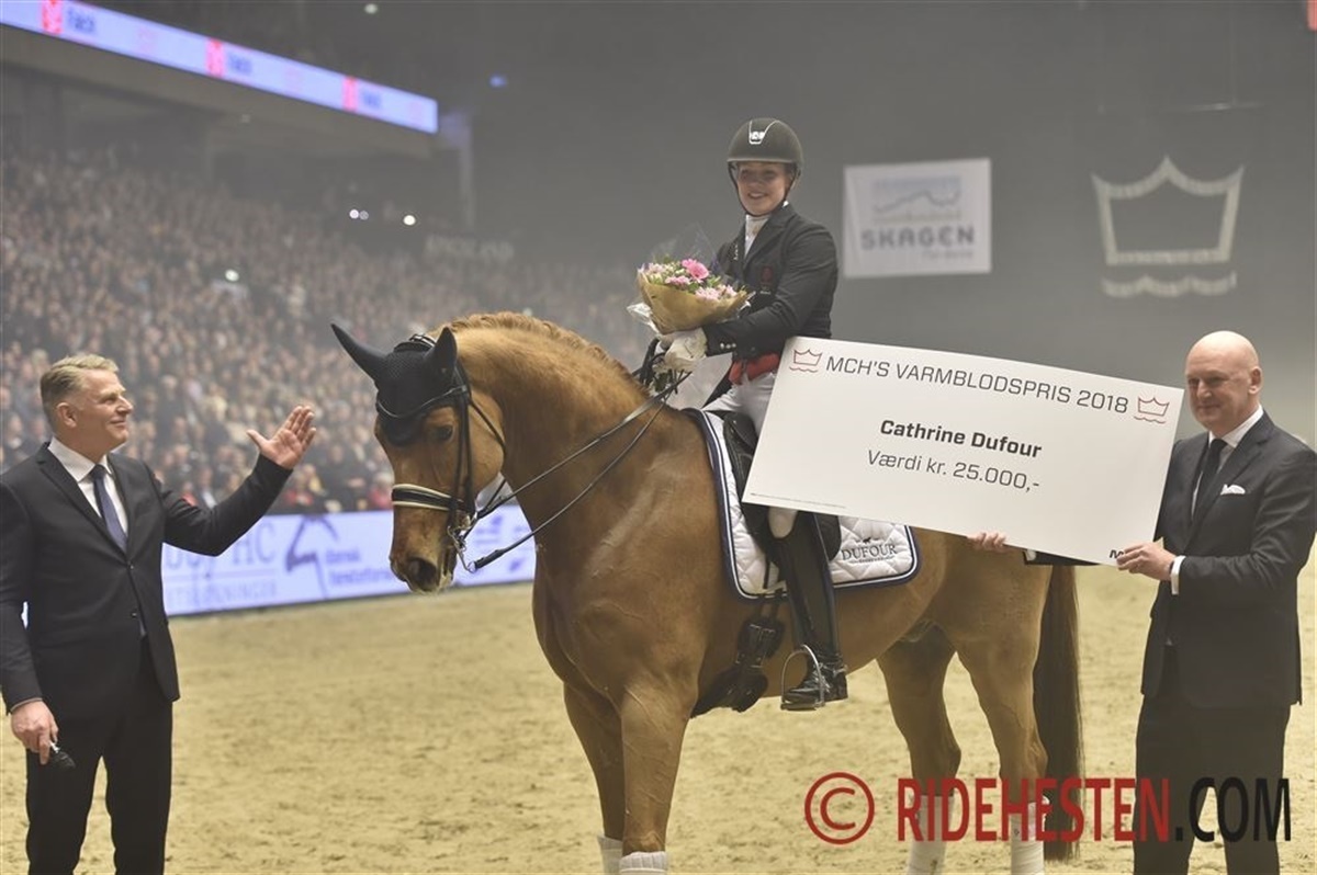 - Siden 2004 har Georg Sørensen og jeg uddelt MCH's Varmblodspris til en, der har gjort en ekstraordinær indsats for Dansk Varmblod. Det har aldrig været svært, og heller ikke i år, hvor prismodtageren er Cathrine Dufour, sagde Dansk Varmblods formand Jan Pedersen, og så jublede de godt 8.000 tilskuere i Jyske Bank Boxen.
