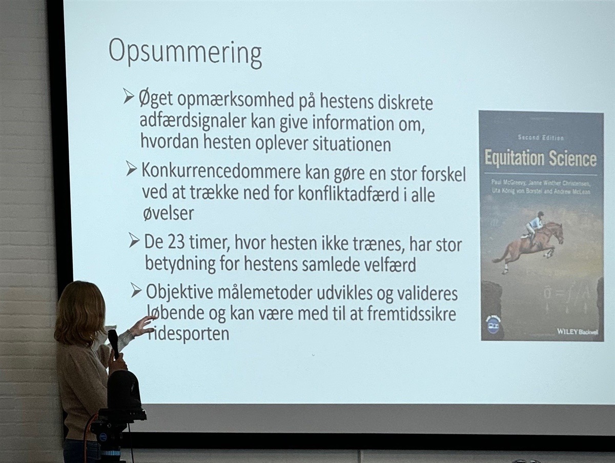 Som keynotespeaker kunne lektor ved Institut for Husdyr- og Veterinærvidenskab, Aarhus Universitet, Janne Winther Christensen i salen følge op på flere pointer fra et forproduceret indslag med den britiske dyrlæge og forsker Sue Dyson. Især forskningen vedrørende hestens konfliktadfærd og smerteindikatorer er oppe i tiden, og der blev også lagt et helt konkret forslag på bordet under debatten: Lad ridesportskonkurrencer få et ekstra lag, hvor en dommer udelukkende tildeler point baseret på, om hesten viser smerte- eller konfliktadfærd, når den er på banen. Et forslag, der lod til at møde opbakning blandt tilhørerne.