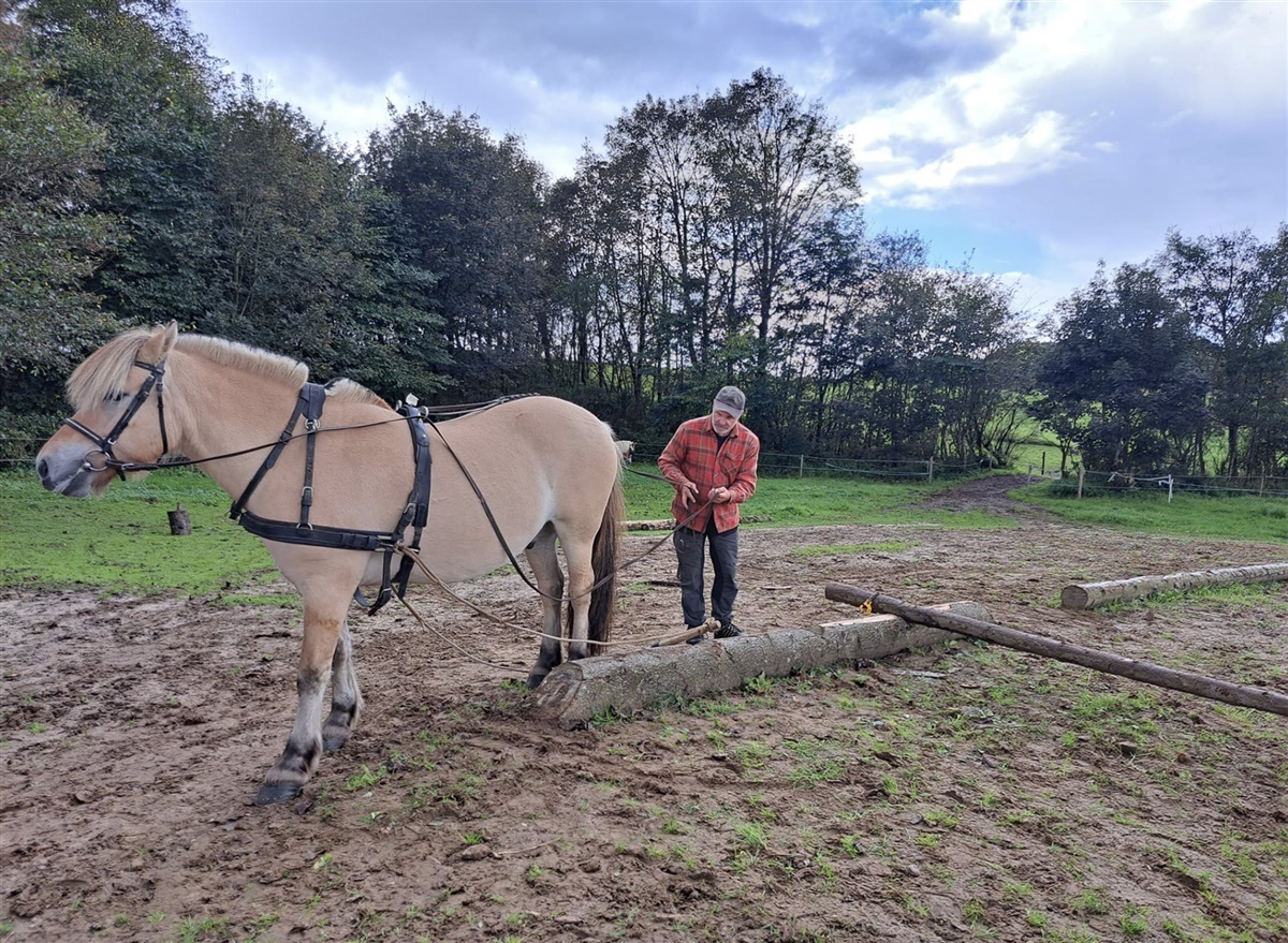 Klokken 14.15-14.45: Tømmertræk: Se hestene trække stammer i og over forskellige forhindringer.