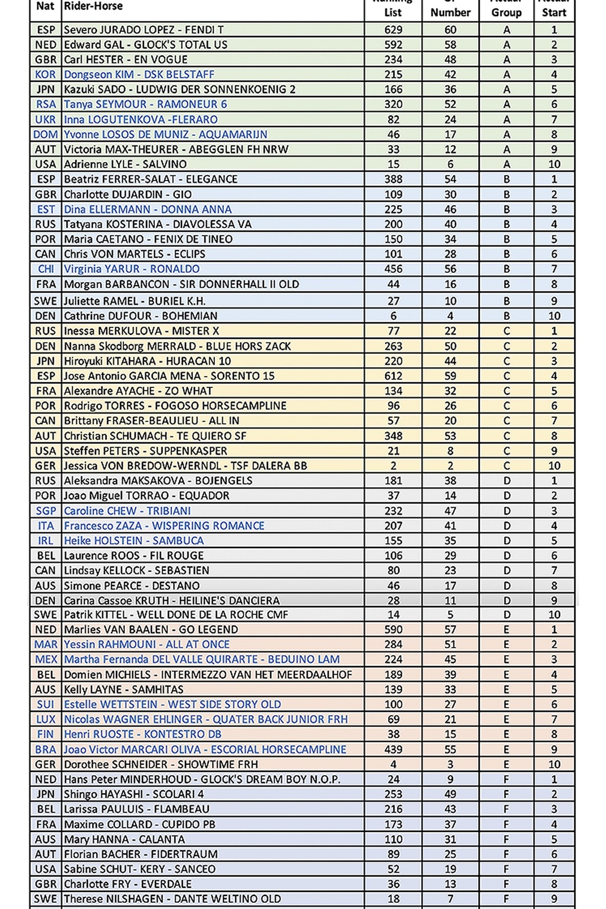 Såfremt at alle heste går gennem vettjek lørdag den 23. juli, så vil 60 ekvipager være til start i Grand Prix'en. Her er startrækkefølgen bestemt ud fra hvordan rytterne rangerer på FEI's verdensrangliste (WDRL) pr. 30/6-2021. Rytterne bliver tildelt et WDRL-nummer fra 1-60, som afgør hvor de bliver placeret i startrækkefølgen. Dog er der lavet nogle rettelser, som sikre at ingen nationer har mere en rytter i hver gruppe eller mere end to på en dag. Rytterne er nemlig delt op i seks grupper, hvor de første tre rider om lørdagen og de resterende tre grupper rider om søndagen.
