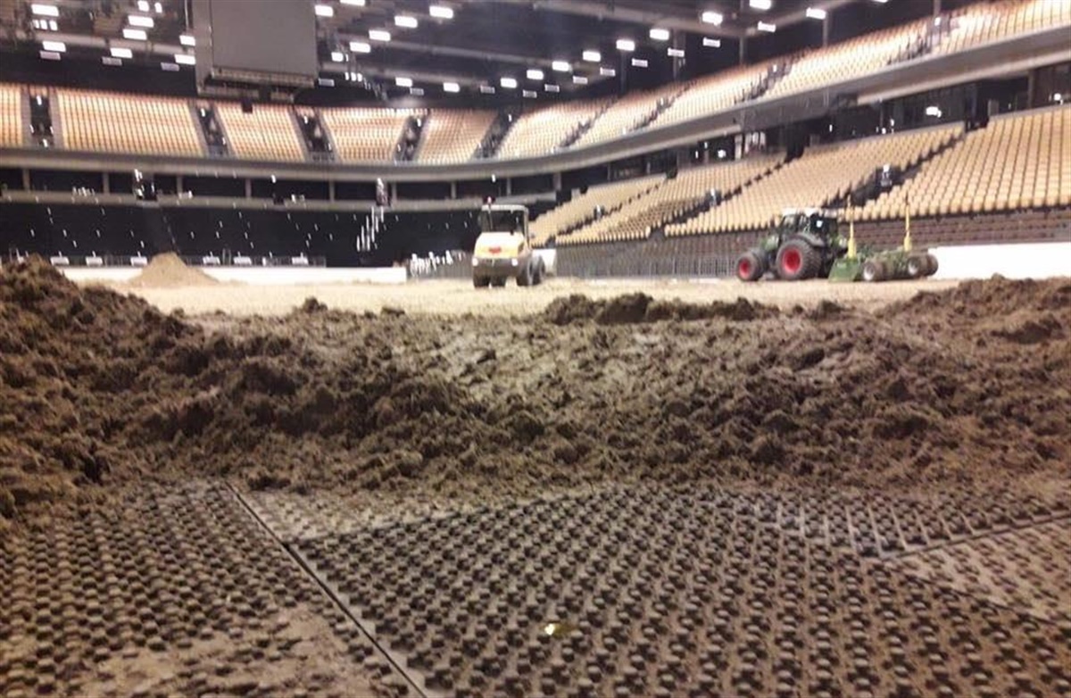 17.000 m2 ridebane med sand og måtter er nu lagt i messehallerne i Herning. De knap to hektar ridebaner er fordelt i Boxen og opvisningshallerne M og E samt C (stald), G (opvarmning) og Q (ekstra 40 x 60 m bane til bl.a. vettjek, opvarmning og daglig træning mv.)