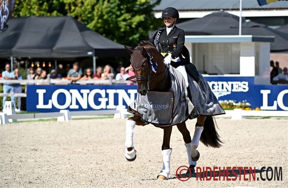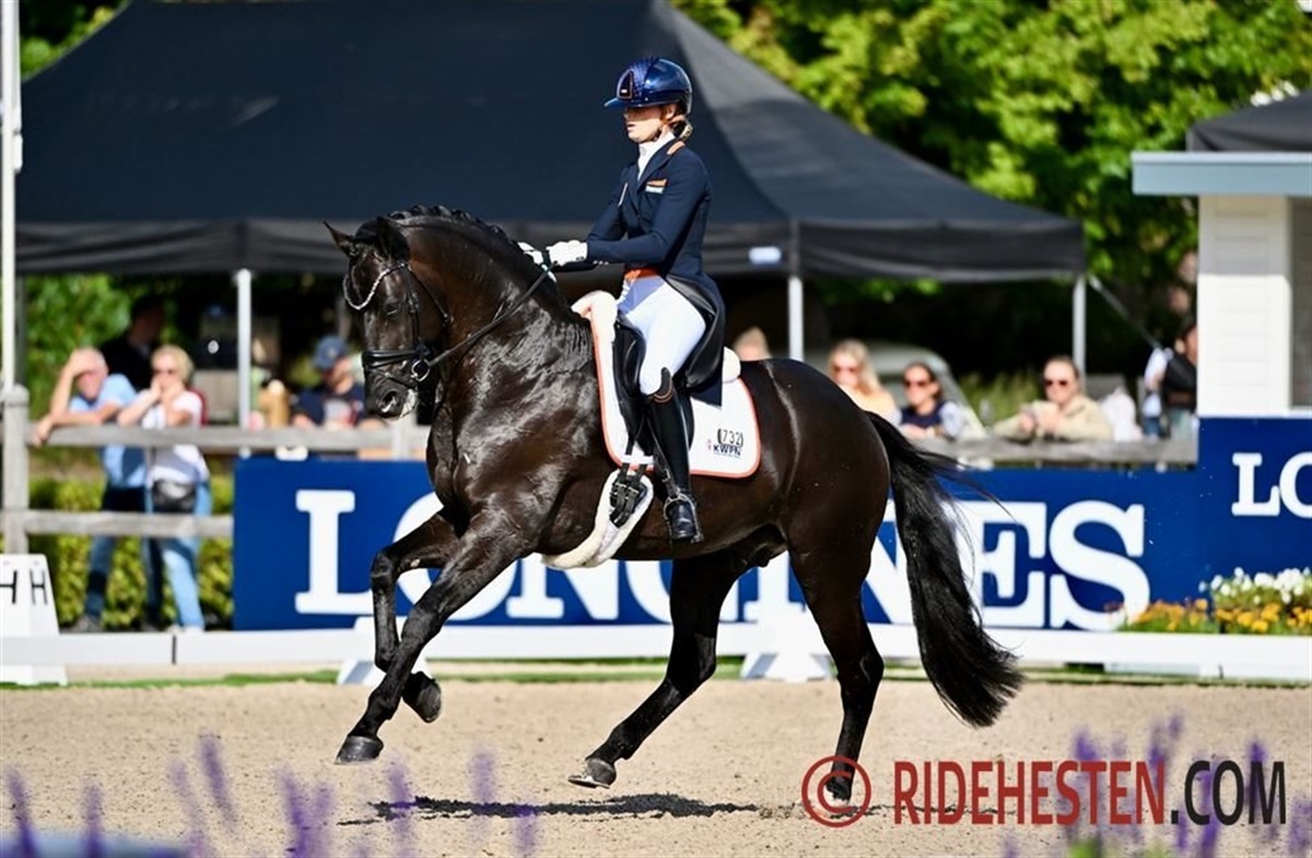Helgstrand Dressages tyske ekvipage Leonie Richter med hannoveranerhingsten Vitalos FRH e. Vitalis/ De Niro har netop sikret endnu en UVM-sølvmedalje, og samtidig opnåede parret 7-års finalens eneste 10-tal for hingstens absolut fremragende trav. I dag var det den knappe energi og takt i den samlede skridt, der skilte dem fra en position som verdensmester. Udover 10 for trav gav dommerne 7,9 for skridt, 9,5 for galop og kapacitet samt 9,0 for ridelighed. I alt 83,222%.