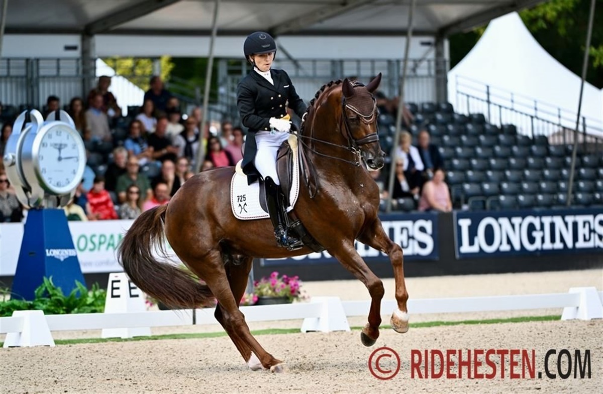 Victoria E. Vallentin har leveret et virkeligt flot ridt med Lyngbjergs St. Paris e. Blue Hors St. Schufro/ Blue Hors Rockefeller (opdr. Bente Børgesson), hvor det hele så ud til at spille. Victoria leverede et meget præcist og veludført program, hvor hun lykkedes med at vise hoppen og dens gangarter på bedste vis. Den meget lette og yndefulde trav med takt, sving og bæring, den taktfaste skridt og en rigtig flot galoptur med gode changementer. Det var forventet, at dommerne gav udtryk for et ønske om, at hoppen skal svinge mere over ryggen i skridt, men da dommer ved C, Ulrike Nivelle, gav kritik af galoppen med et ønske om mere op-ad-bakke-tendens, begyndte publikum at klage sig over kritikken og de generelt konservative karakterer for det flotte ridt. Teknisk fik ekvipagen den hidtil bedste score på 73,430, mens kvalitetskaraktererne lød på 9,0 for trav, 8,0 for skridt, 8,3 for galop og 8,5 for såvel ridelighed som kapacitet. Med 79,015% har parret lagt sig i spidsen af klassen.