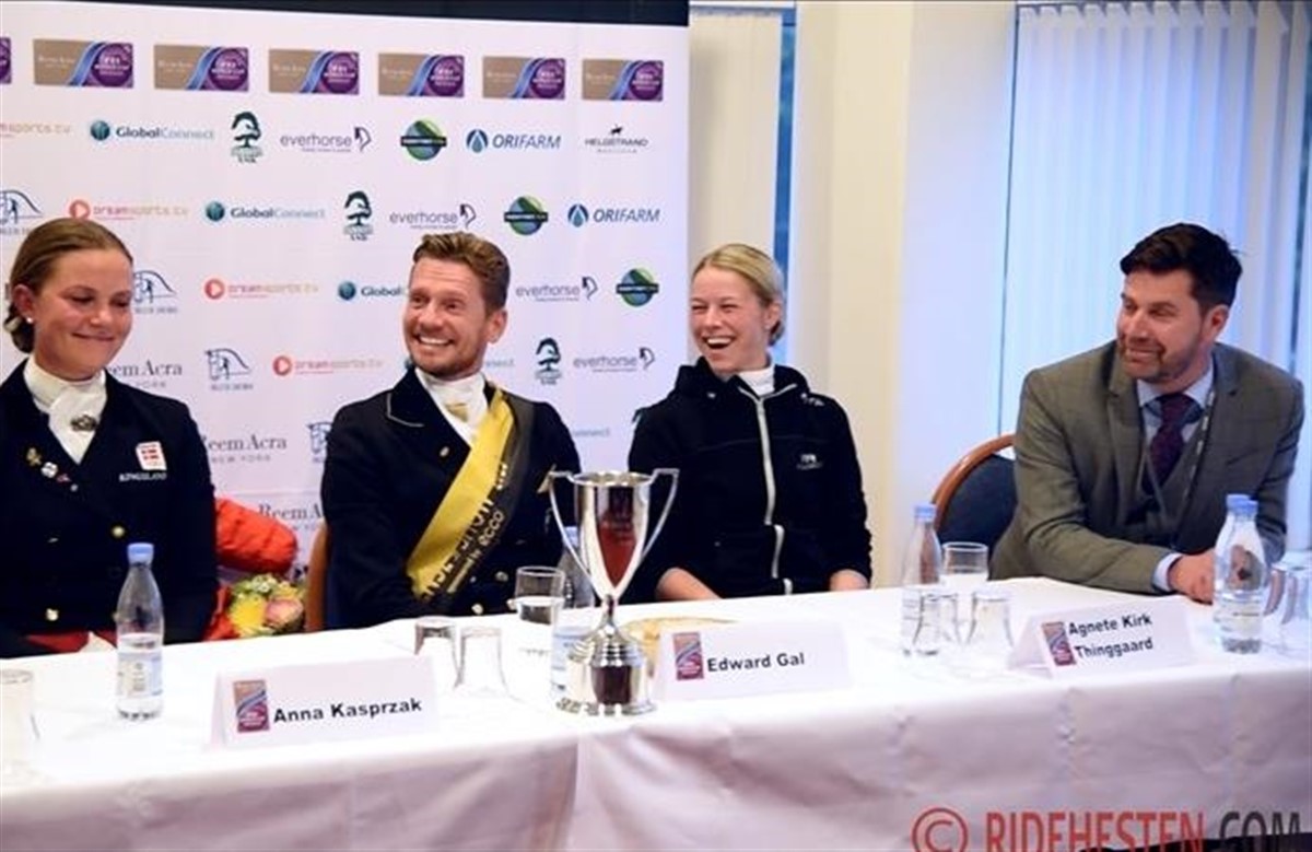 Det var en meget tilfreds Edward Gal, der mødte op til pressemøde efter at have vundet World Cup kür til Odense Horse Show sponsored by Ecco, og det fik ham til at love at komme igen næste år. Anna Kasprzak havde håbet på et bedre ridt, mens Agnete Kirk Thinggaard viste stor glæde for sin placering. Se uddrag fra pressemødet her, og hør blandt andet rytternes planer for den kommende sæson