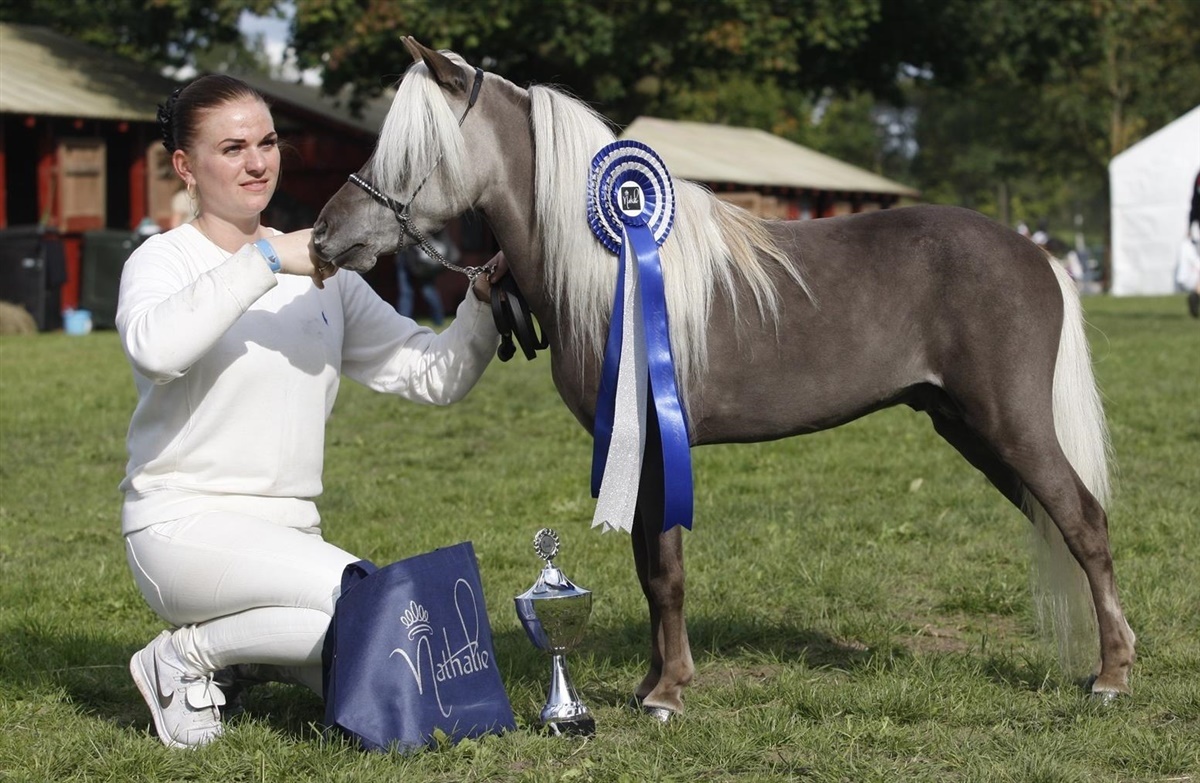 Den sølvglinsende miniaturehingst Headliner var groomet perfekt ned til mindste detalje og vandt derfor over de ellers nydeligt pyntede shireheste i første afdeling af Nathalie Horsecares danmarksmesterskab i Grooming, der i dag blev afholdt på Store Hestedag.