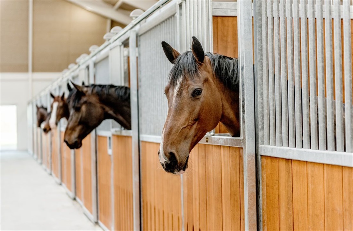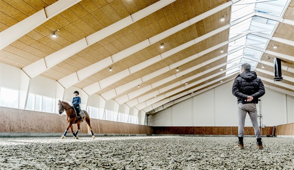 Det nye center rummer to store lyse ridehaller på hhv. 30x70 og 20x60 m med Walber ebbe/flod fiberbunde og staldområder med 84 store lyse Röwer & Rub hestebokse.