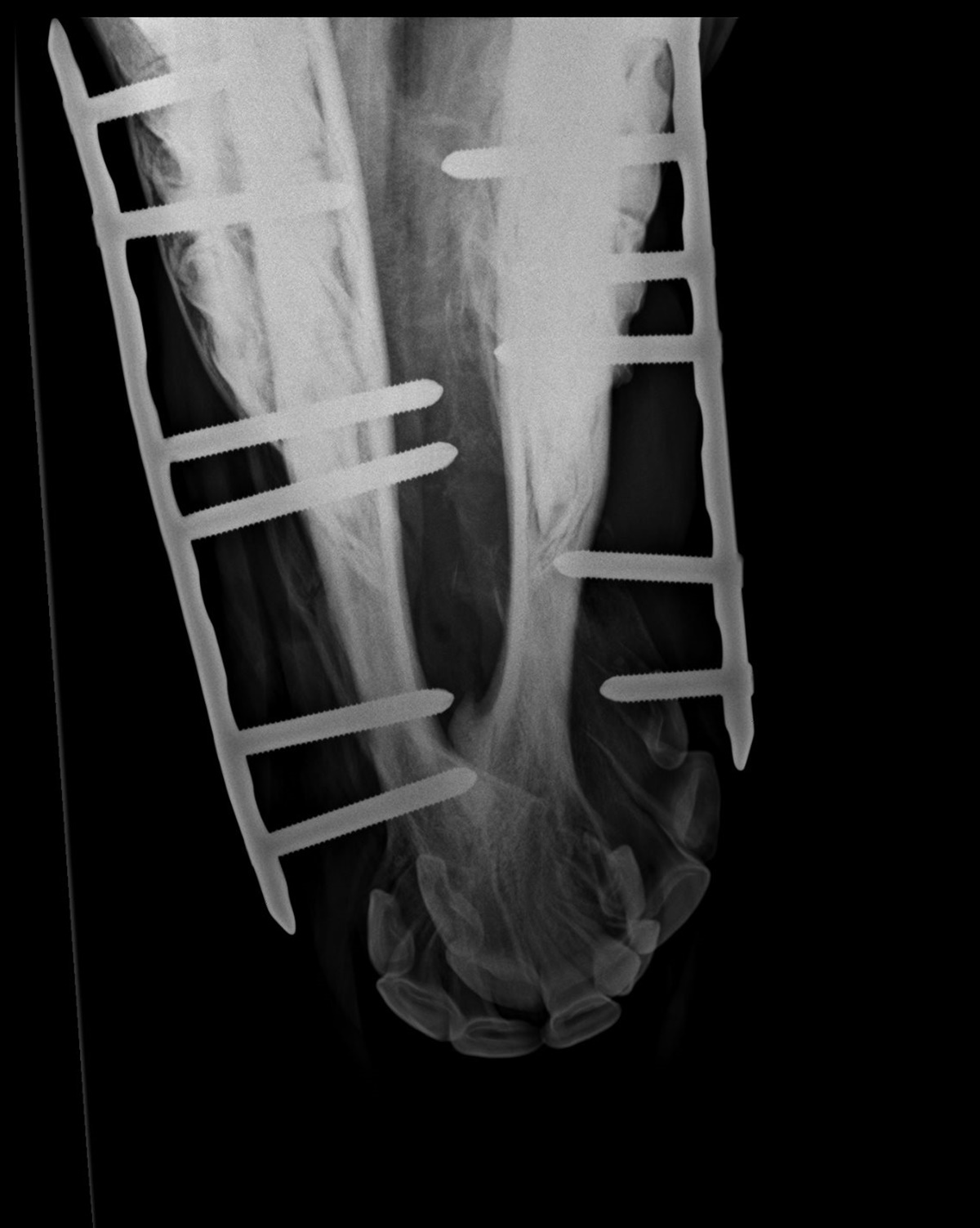 Christina ved ikke præcis hvad dyrlægerne har gjort, men Viljas mule er blevet rettet op, og hun står pt. med skinner og skruer, som skal holde det hele på plads.
