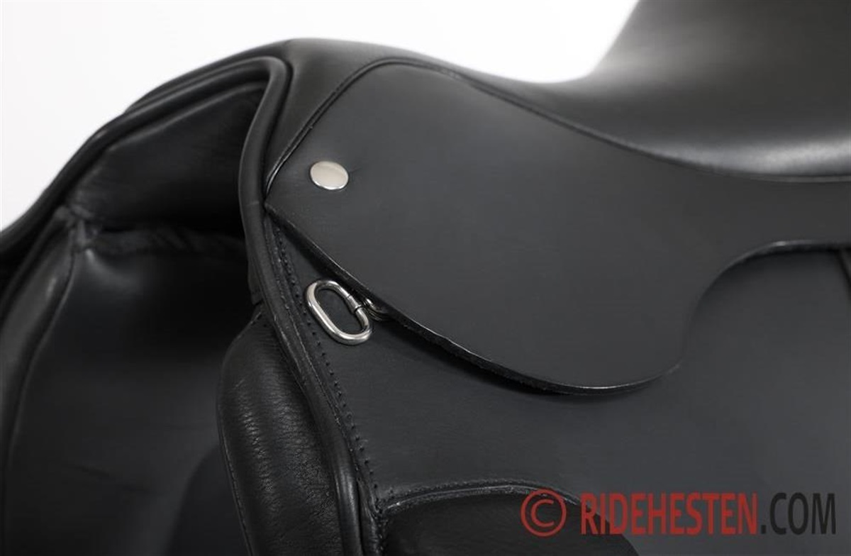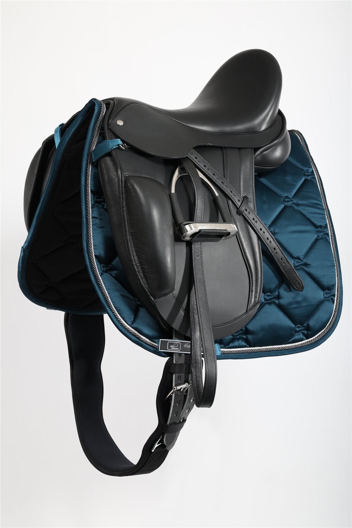 Sadlen er en 17" sadel med udskifteligt kopjern. Den er fuldt monteret med et smukt satin underlag fra Pro Collection i farven Petrol, 75 centimeter neoprengjort fra 4Horeses med indbygget trykaflastende memoryfoam og 160 cm læderstigremme med flex-stigbøjler fra Rider's Company.