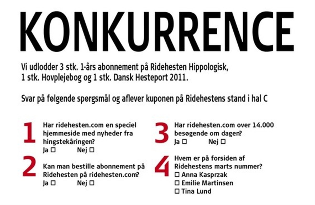 Under hingstekåringen og Hest & Rytter messen i Herning havde vi konkurrencer på Ridehestens stand i hal C. Vi har nu udtrukket de 5 heldige vindere: 3 stk. 1 års abonnement på Ridehesten: Stine Dam Andersen fra Løgumkloster Ea Aunsbjørn fra Hørsholm Christine Damberg fra Malling 1 stk. Dansk Hestesport 2011: Anna Meltz fra Nivå 1 stk. Hovplejebog: Alice Nielsen fra Tårs Præmierne bliver sendt direkte til vinderne. Vinderne i Ridehesten Juniors konkurrence kan ses på www.ridehestenjunior.dk