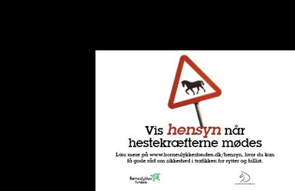 ‘Sikkerhed først’ - en vigtig kerneværdi ‘Sikkerhed først’ er en vigtigt kerneværdi i Dansk Ride Forbund. Forbundet arbejder løbende på at øge sikkerheden til hest, både når omgangen med heste foregår i stalden, på banen, i skoven og ikke mindst i trafikken. ”Sikkerhed har topprioritet hos os, og hvis vi skal øge sikkerheden for alle i trafikken, er det vigtigt at få kommunikeret et budskab, som alle forstår. Derfor er Dansk Ride Forbund glade for samarbejdet med Børneulykkesfonden om denne kampagne med fokus på sikkerhed i trafikken. Både ryttere og øvrige trafikanter skal kort sagt lære gensidig respekt og hensyn”, siger Ulf Helgstrand, formand i Dansk Ride Forbund. Én ulykke er én for meget Årligt sker der omkring 130 riderelaterede ulykker i trafikken, og 20-30 af dem involverer andre trafikanter. Det viser en undersøgelse foretaget af Statens Institut for Folkesundhed. ”Tallene viser med al tydelighed, at der er brug for at fortælle ryttere, bilister og cyklister, at det i trafikken handler om at vise hensyn og gensidig respekt. På denne måde vil vi sikre, at alle kan færdes sikkert side om side. Sammen med Dansk Ride Forbund, vil vi meget gerne lave om på den kedelige ulykkesstatistik, vi ser i ridesporten ift. Trafikken, og vi håber, at kampagnen Vis hensyn, når hestekræfterne mødes kan hjælpe til dette” siger Henriette Madsen, Relations Manager i Børneulykkesfonden.