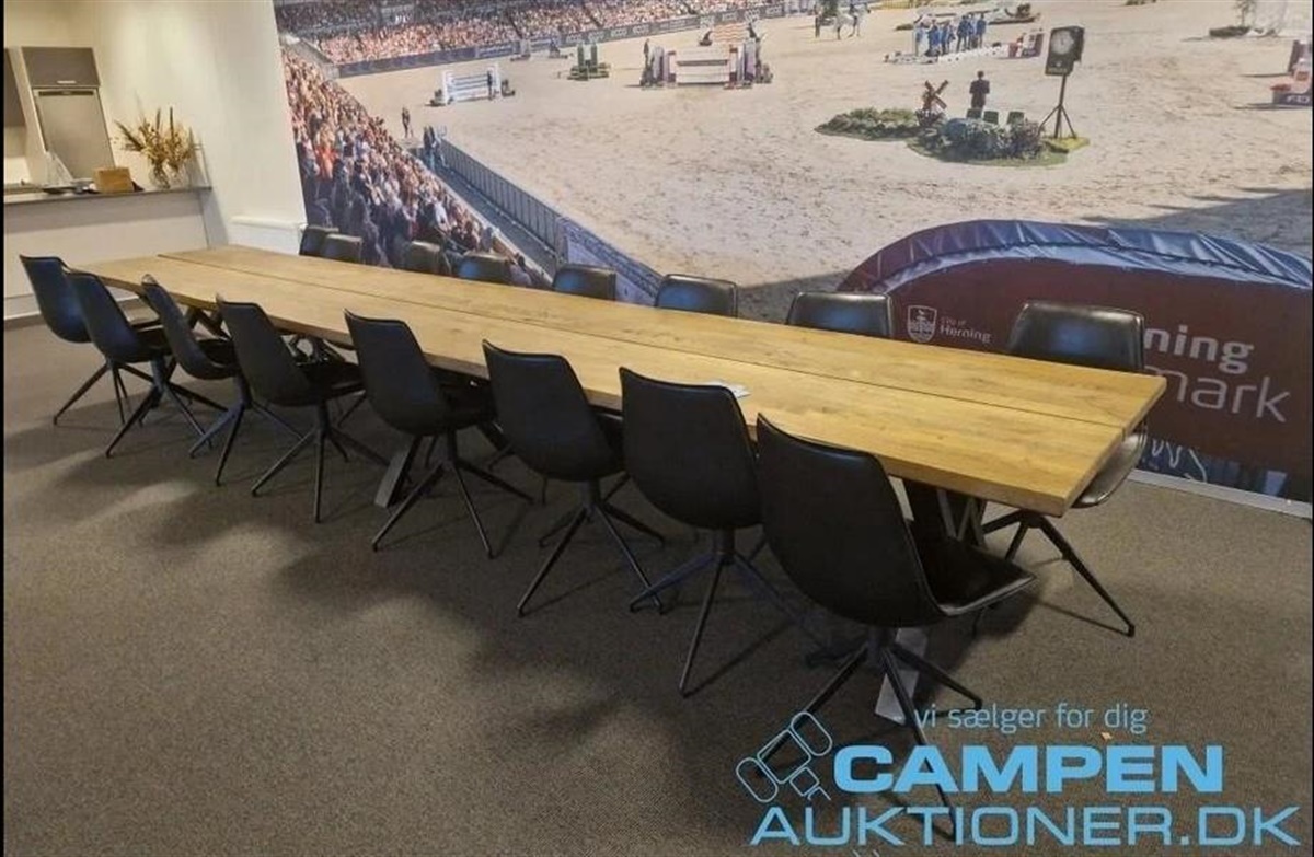 Nu er kontorinventaret sat på Campen Auktioner, og det omfatter bl.a. hæve-/sænkeborde, skærmvægge, pc-skærme, planter, printere m.v. samt et smukt konference-plankebord med læderstole og en receptionsdisk.