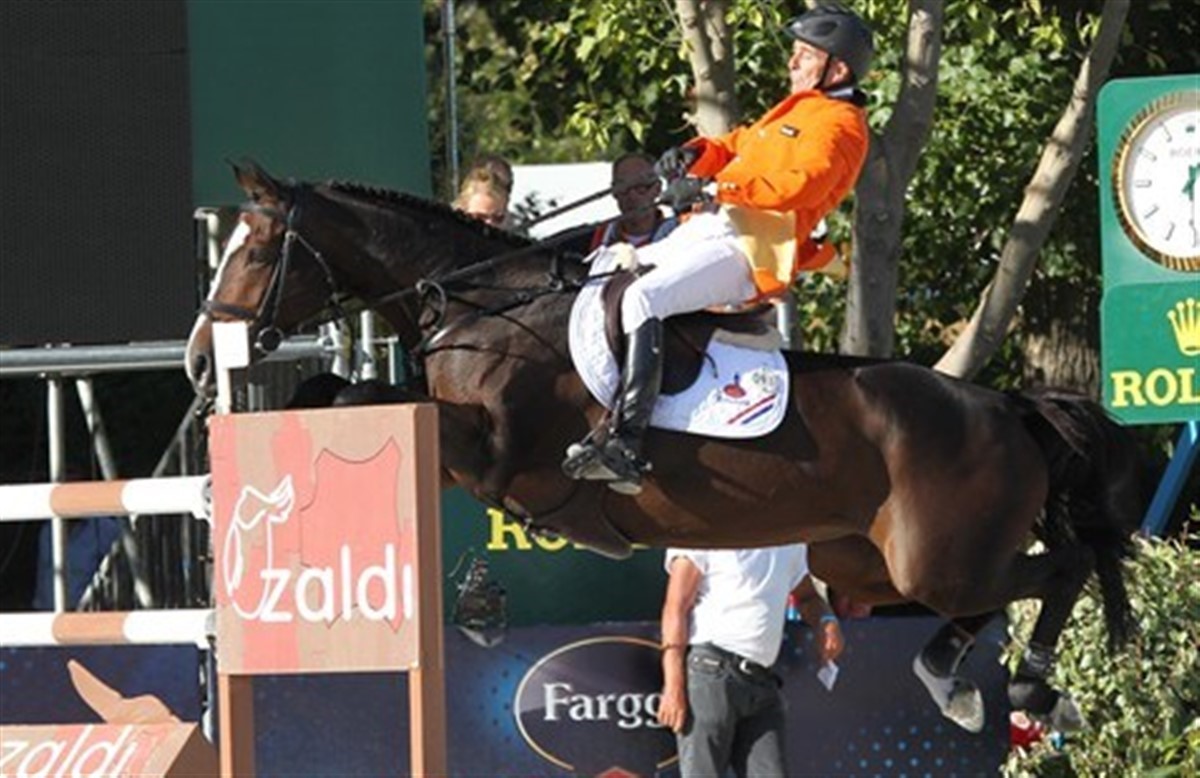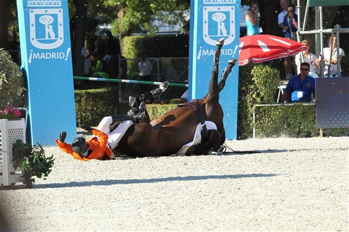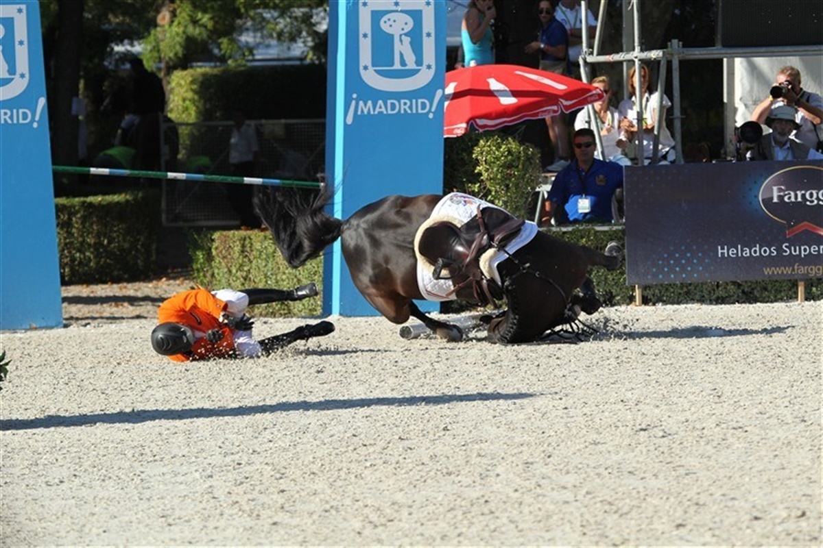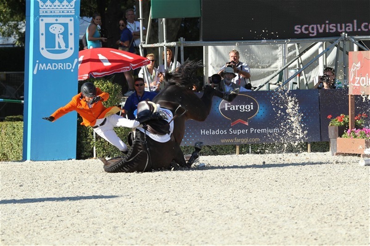 Eric van der Vleutens VDL Groep Utascha SFN fejlbedømte forhindring nr. et og sprang af jorden et galopspring for tidligt. Hoppen brasede gennem forhindringen, slog rundt, og vred halsen i en helt umulig vinkel, altimens Eric fløj gennem luften. I flere sekunder lå hoppen på ryggen og kæmpede for at rulle rundt, men sadlen var i vejen. Endelig kom hun om på siden og kunne rejse sig. Det var et voldsomt styrt, men en efterfølgende, grundig undersøgelse af hoppen har heldigvis vist, at hun er sluppet fra styrtet uden mén.