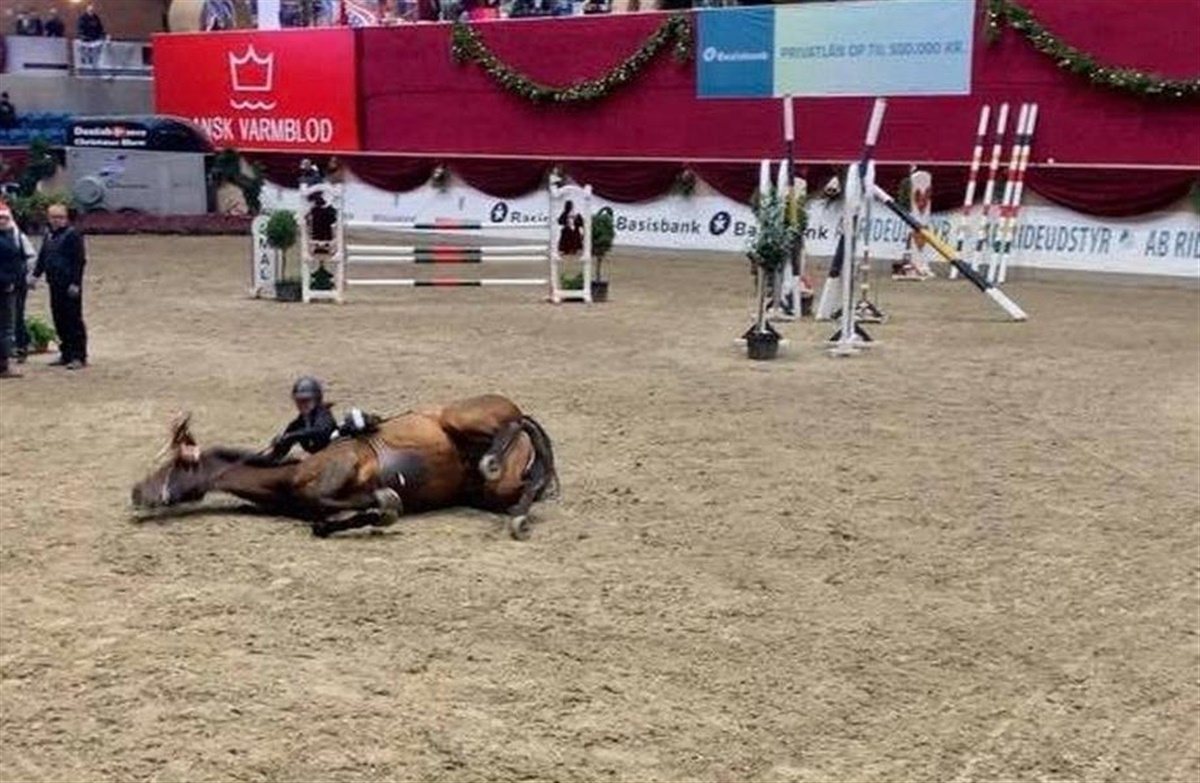 Det var lidt en voldsom oplevelse for Christine Krogh Frausing i tirsdags under dette års Christmas Show. En ellers god runde på banen, som rakte til en fjerdeplads, endte i et styrt under præmieoverrækkelsen, da hendes hest blev bange for en af de andre.