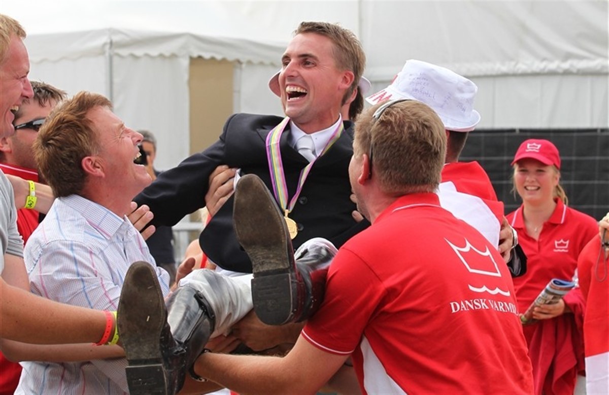 Humøret i Dansk Varmblods lejr var meget højt efter endnu en sejr ved UVM i Verden. Der manglede ikke gode og festlige påfund fra Esben Møller, der efter at have badet Joan Andreasen i champagne og udlovet gratis bedækning ved Don Schufro til hendes hoppe, tog initiativ til at give den nykårede verdensmester Andreas Helgstrand en flyvetur.