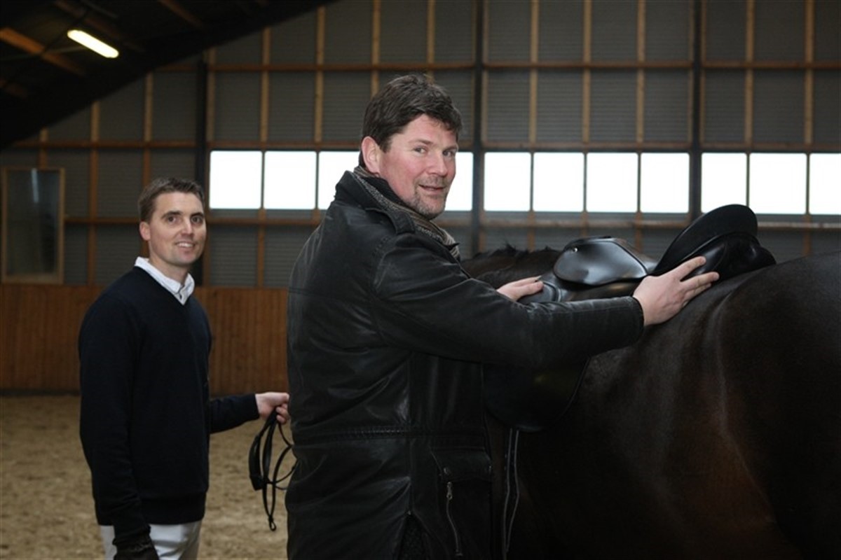 Olof Ingdams fra Ingdams er på besøg hos Andreas Helgstrand for at tilpasse sadel til Andreas nye hingst Carabas. Læs også temæt om sadler i Ridehestens januarnummer 2009.