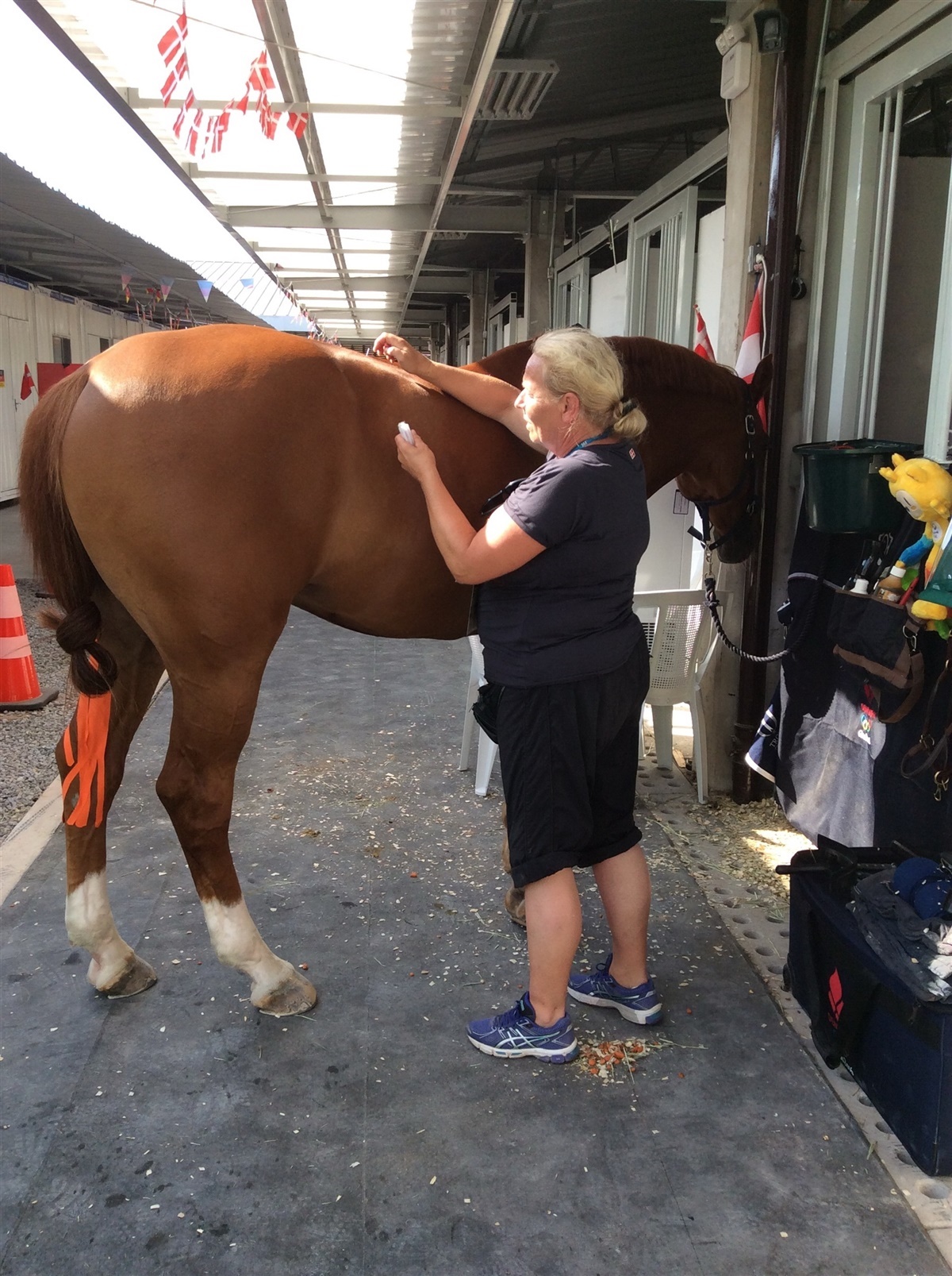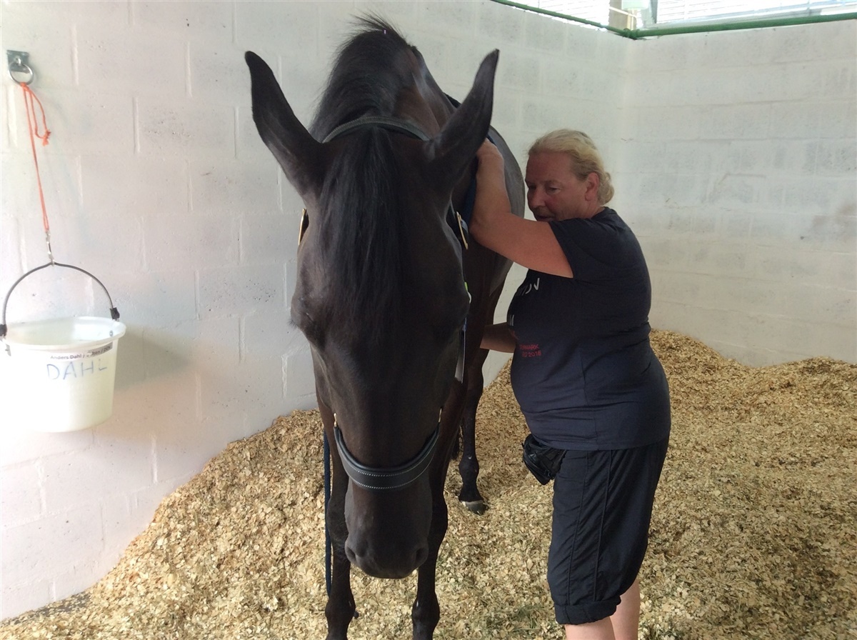 Hver dag gennemgår hun alle hestene nøje, for at finde ømme eller låste områder. - Vurderer jeg så, at vi lige skal følge formiddagens behandling op, så kan jeg om eftermiddagen give dem akkupunktur eller kinesiotape - det er tilladt selvom de er på vej i konkurrence. Vi må bare ikke lade hestene gå ud af staldområdet med kinesiotape på, fortæller Gitte. Hun har en tæt dialog med rytterne, som forklarer hende, hvordan hestene føles i træningen, om de er lige smidige til begge sider ol.