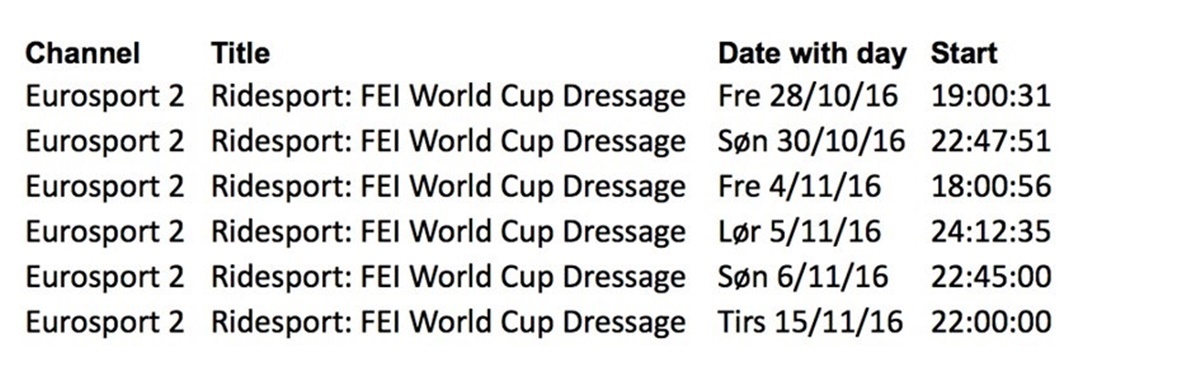 World Cuppen i dressur vil blive vist på Eurosport, og der vil ligeledes komme et par genudsendelser, så det er muligt at se klassen, hvis man ikke lige er hjemme på den bestemte dag. Se herunder tiderne, hvor den vil blive vist på Eurosport.