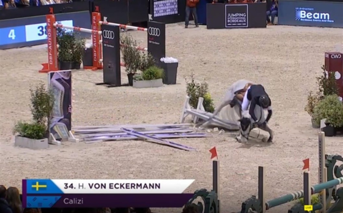 Stævnet i Bordeaux forløb dog ikke uden dramatik. I lørdagens World Cup-klasse havde den svenske toprytter, Henrik von Eckermann, et voldsomt styrt med hesten Calizi e. Cellestial/ Stakkatol. Styrtet skete i slutningen af hovedrunden i World Cup-klassen, hvor Henrik og Calizi styrter på vej ind i en forhindring.