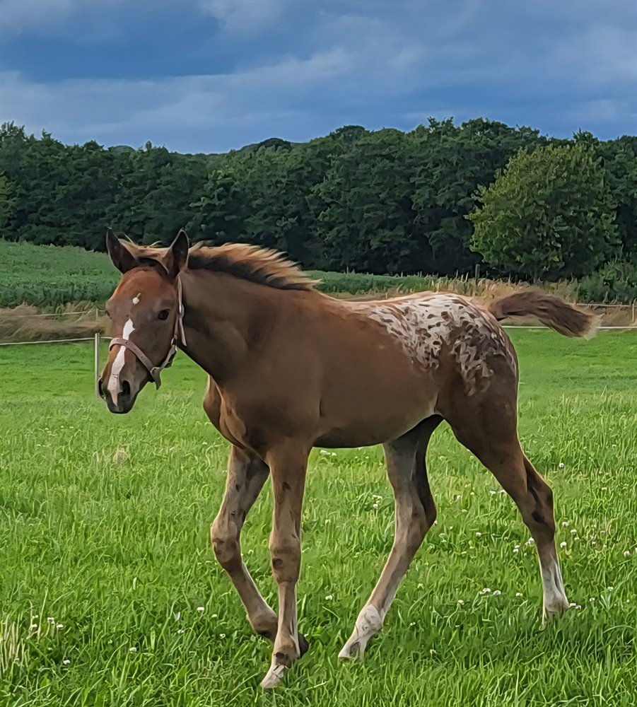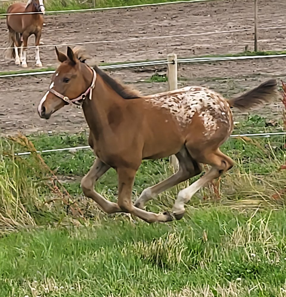 Er du på udkig efter en helt særlig hest med både udstråling og kvalitet? Dette skønne føl er et sandt liebhaberi med de smukkeste pletter og et spændende dressurblod, der lover stort potentiale for fremtiden.