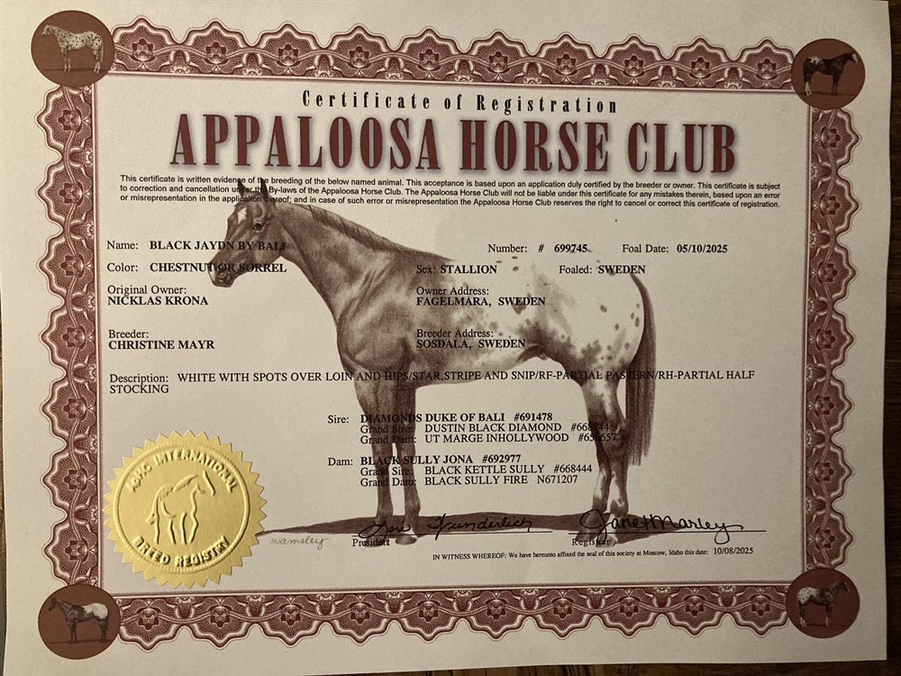 Registered in ApHC in the USA and passport issued by SAAHR.