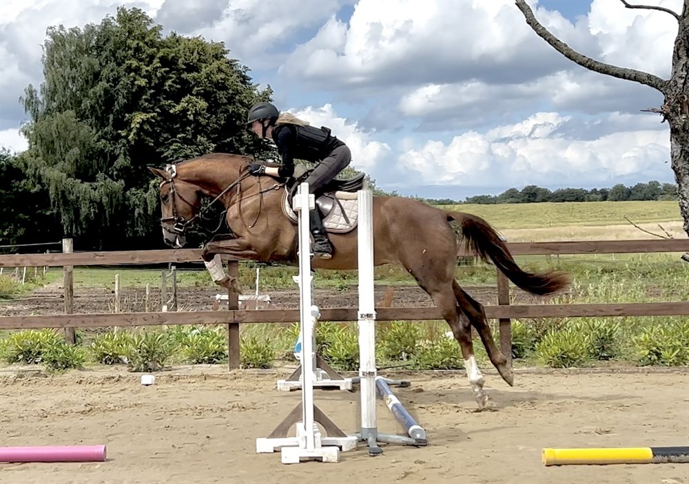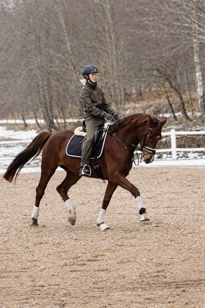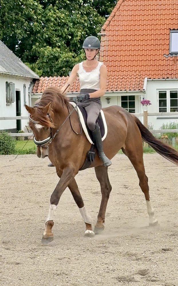 Hun er dejlig at være på og har tre gode gangarter med særligt god galop og god bagbensaktion. Hun har prøvet enkelte spring med rytter og er løssprunget flere gange med god lyst og kapacitet. Hun har også været på små ture i skoven og tager nye ting fint, men protestere også gerne.