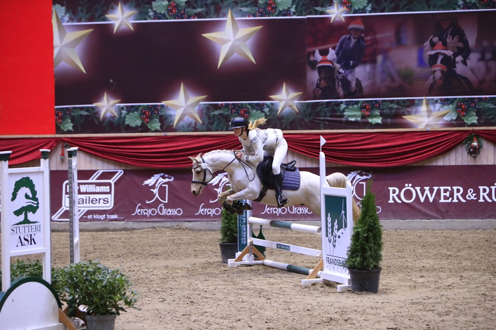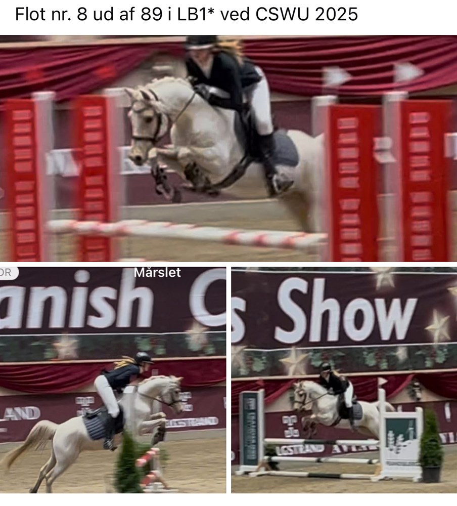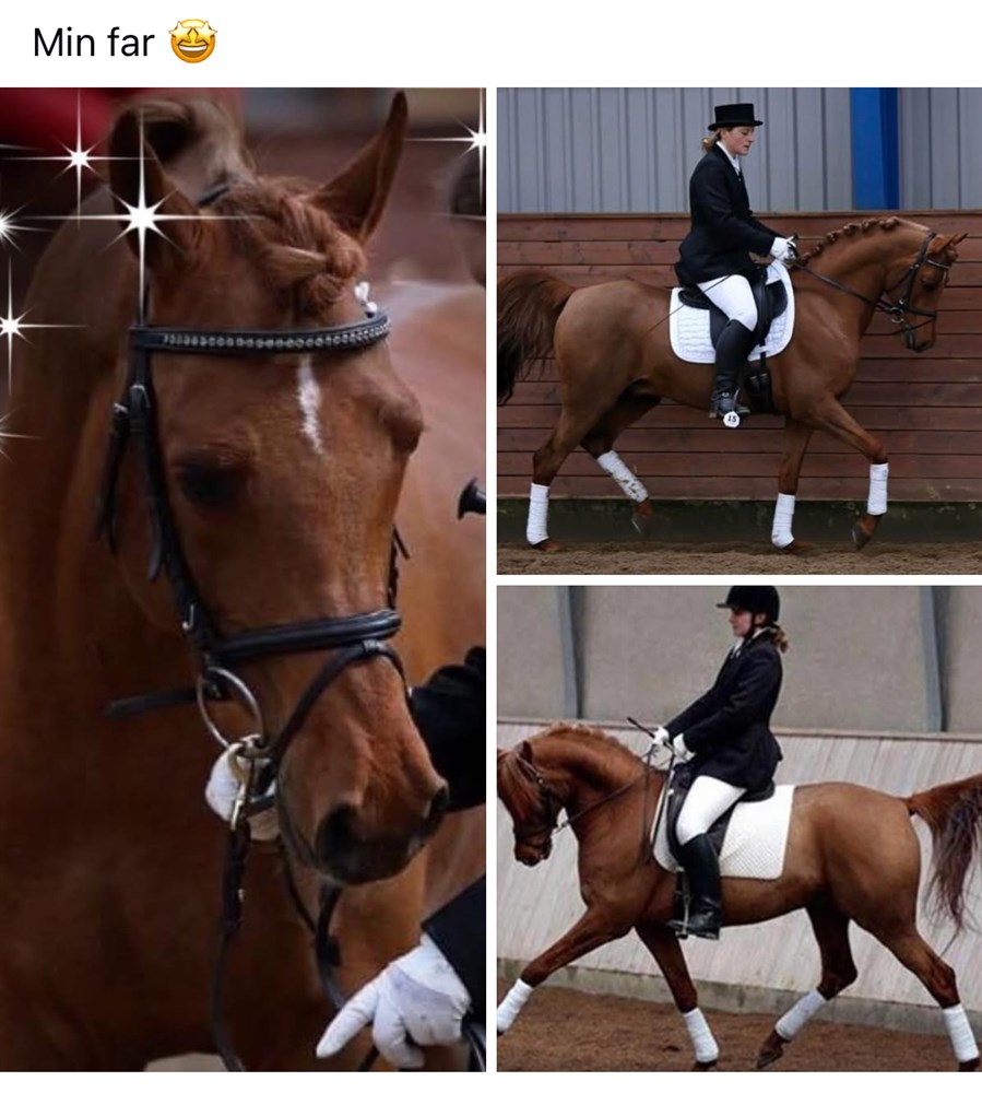 Vi har store forventninger til ham. Vi har dog prioriteret at starte stille ud for at få gode oplevelser og rutine. Han springer snildt og stabilt baner på 90 cm med den store rytter (startet t.o.m. LB2* og den lille, knap så rutinerede rytter har redet 75 cm baner på ham - ligeledes helt uproblematisk. Potentialet er der også i dressur og der er heller ikke noget “men….” Han er startklar i LA + kan også gå galop-skridt-overgange.