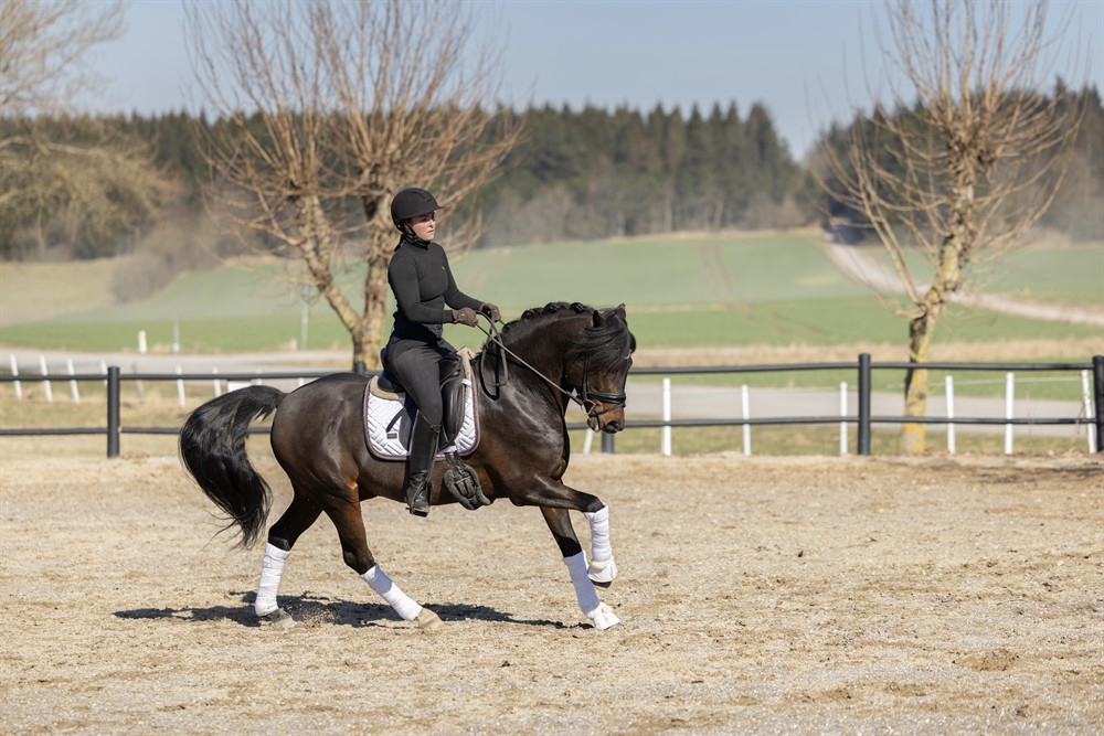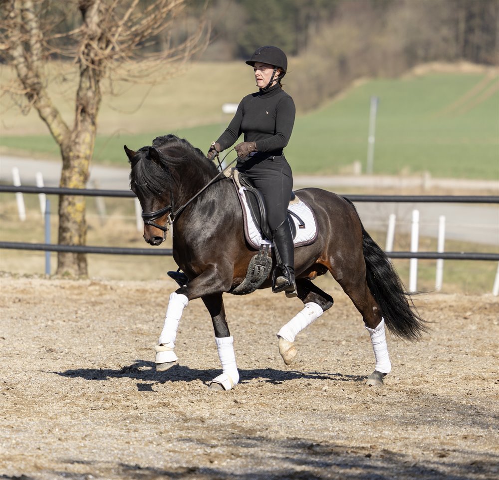 Han mestrer alle ponyøvelser, har startet til og med LA6 mod heste og viser stor styrke i bl.a. sidebevægelser og kontragalop.