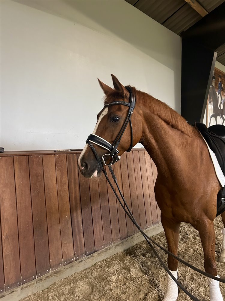 D’Angleterre er en elegant velgående 6-årig hoppe med en iøjnefaldende rød farve og fire fine, hvide sokker. Hun er efter D’Avie og med Blue Hors Zack som morfar.