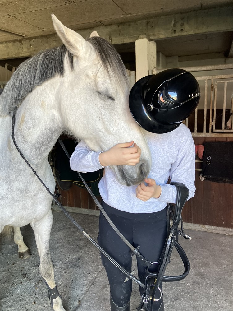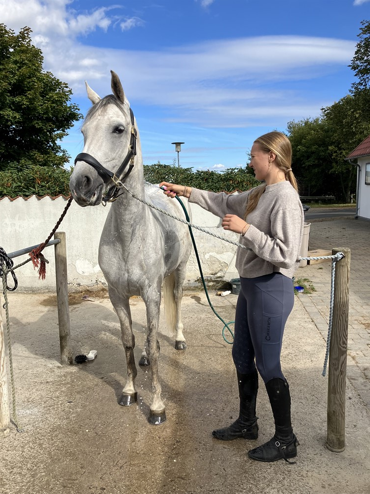 Hver uge får min datter undervisning i spring og dressur af professionelle undervisere. Vi lægger stor vægt på alsidig træning og afvekslende ridning på marken, samt at skifte mellem at ride udendørs på ridebanen og i ridehuset. Lacosta er ligeglad om der en mange eller få heste i ridehuset. Alt tager hun i stiv arm.