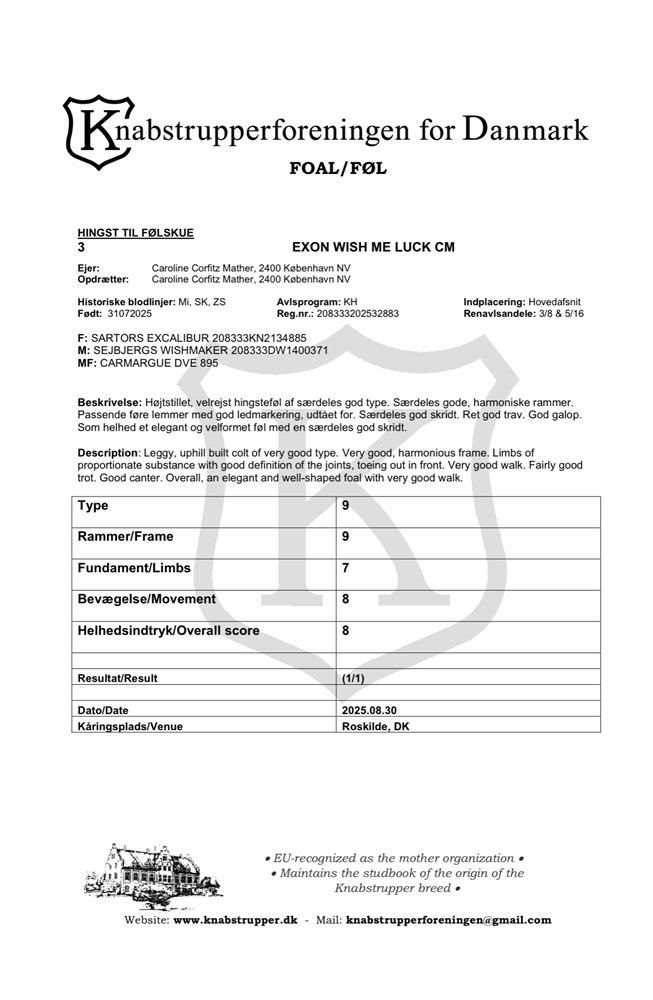 | Mor: SEJBJERGS WISHMAKER (208333DW1400371) | MF: CARMARGUE (DVE 895) | MFF: CASSINI II (DE321210202094) |