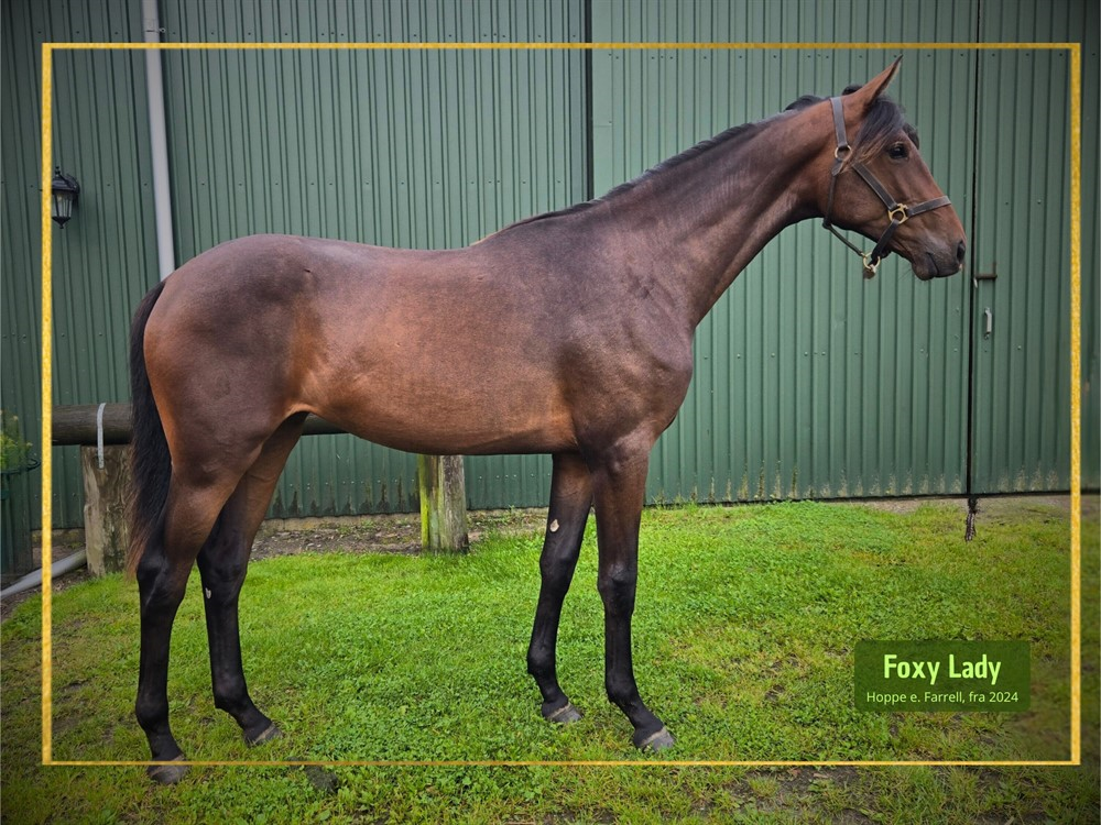 Foxy Lady er et super smukt og velgående hoppeplage efter hingsten Farrell. Hun er brun uden aftegn. Foxy er daglig i hænder, er vant til skridtmaskine, har været lidt i longe og selvfølgelig passet med smed, ormekur og vaccination. Forventet stangmål er +1.75m. Pris kr. 49.500