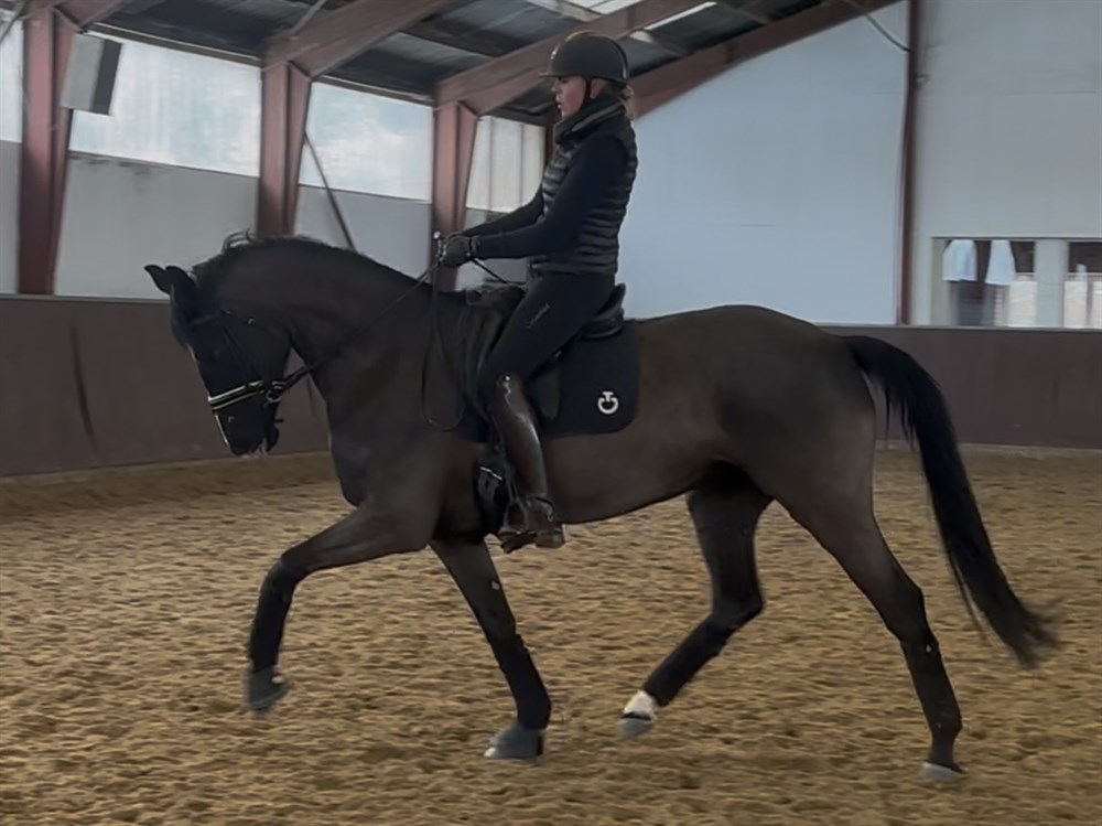 Smuk sort hoppe med masser af udstråling og kvalitet. Hun udvikler sig hele tiden og vil blive fantastisk på konkurrence banerne. Hun er påbegyndt øvelser frem mod middelsvær dressur.Hun er positiv og er på begyndt changementer og laver rent byt. sælges for avler.