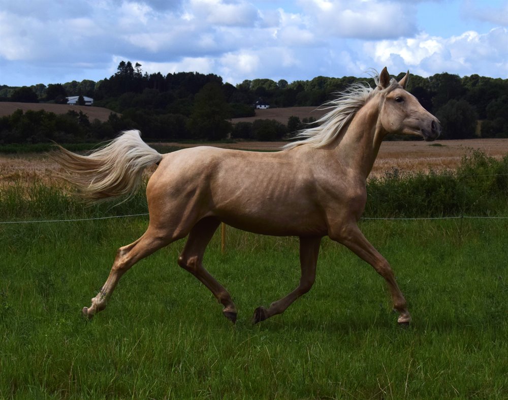 Jeg forventer at hun bliver 167-172 cm i stang. Hun er målt med målebånd til 154 cm på sin 1-års fødselsdag og sigøjnermål gav en forventet sluthøjde på ca. 172 cm. Hun er dermed en af de få palominohopper der også passer til lidt langbenede ryttere og hun vil ligeledes være en oplagt kandidat til avl.