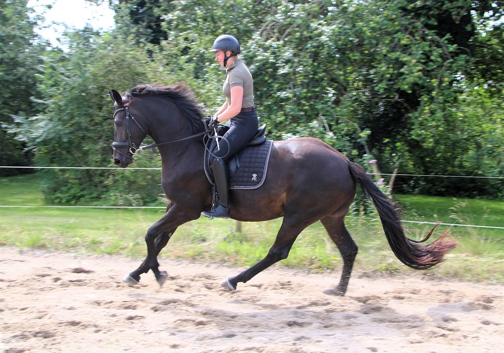 Conus går pænt i alle tre gangarter og viser fine takter for fremtiden. Han vil være et oplagt valg, hvis du søger en alsidig ridehest og unghest at videreuddanne, samt en god kammerat i det daglige.