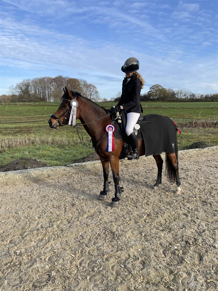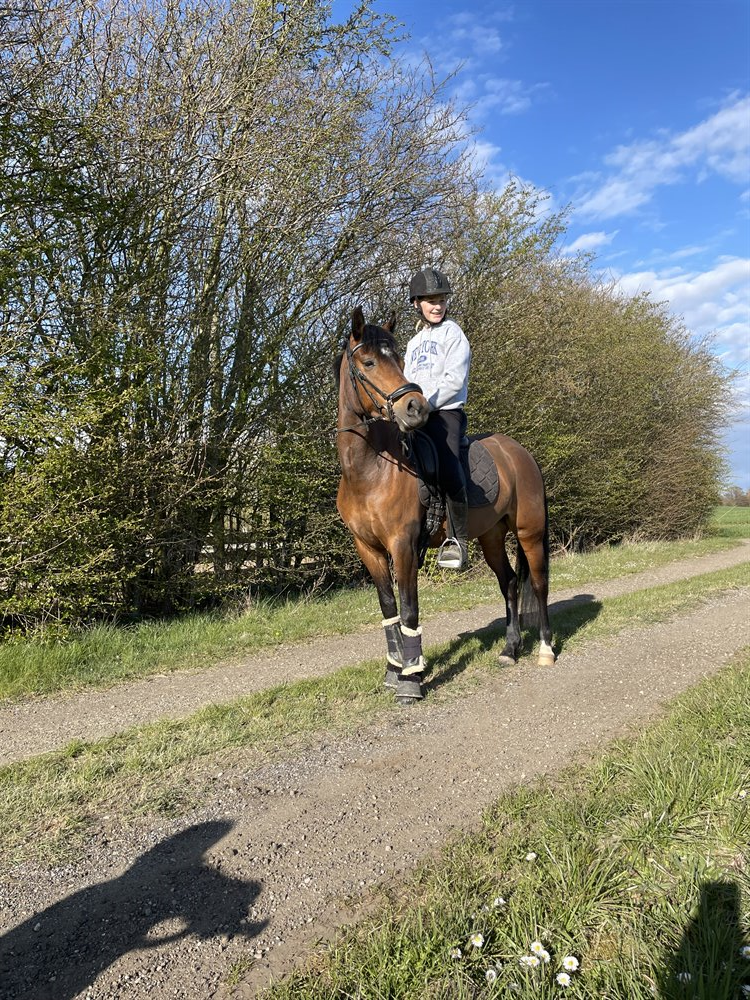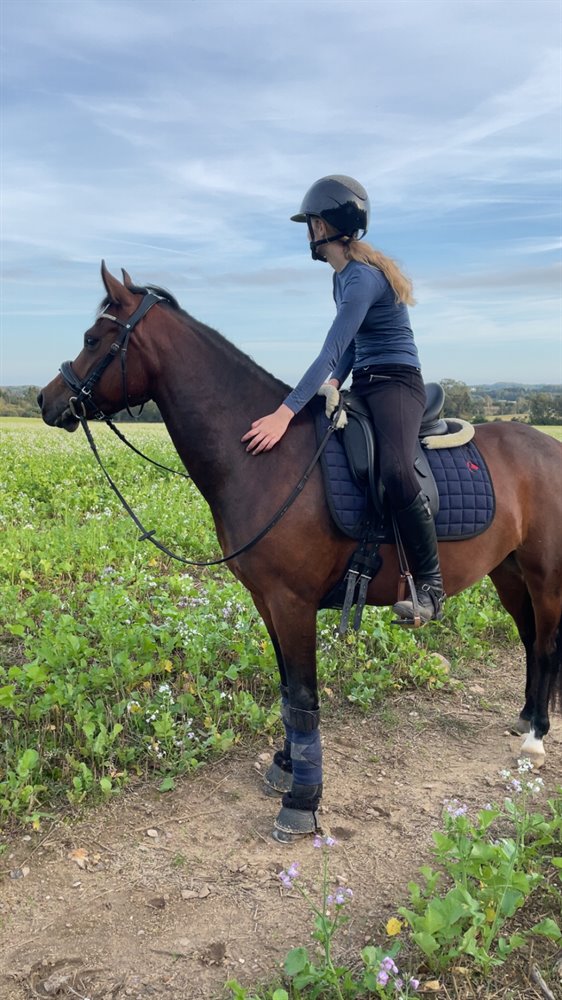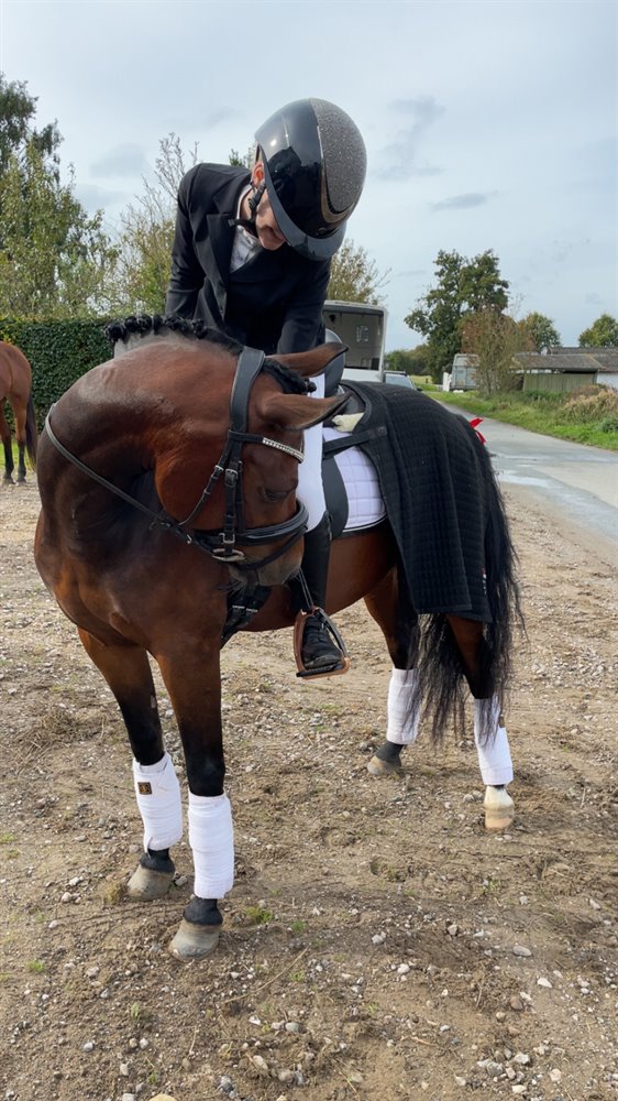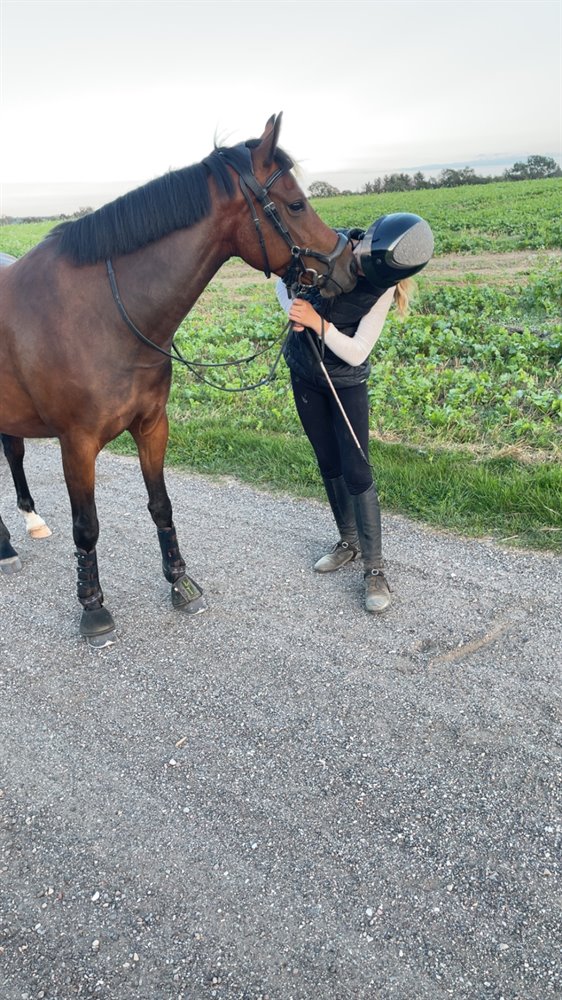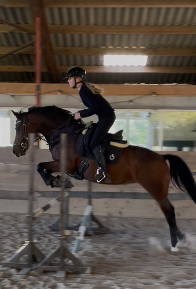 Hun rides flere gange om ugen og arbejder i dressur, spring og på tur.