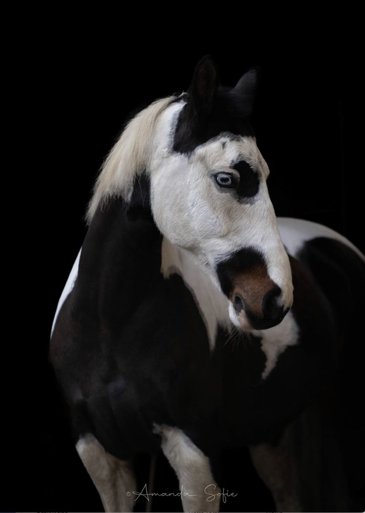 Pinto er 16 år hoppe og en flot højde på 147 cm, hun har 2 blå øjne, med grøn pas.