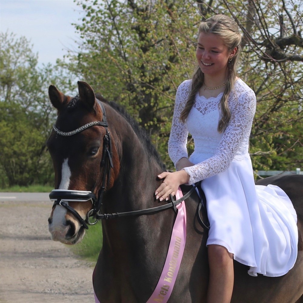 Er sød i al omgang, kan tages ind på stald alene, rides både ude, inde og på tur alene og med andre. Trafiksikker. En pony man altid kan sætte sig op og ride på, selv efter mange fridage. Kan også rides af en voksen.