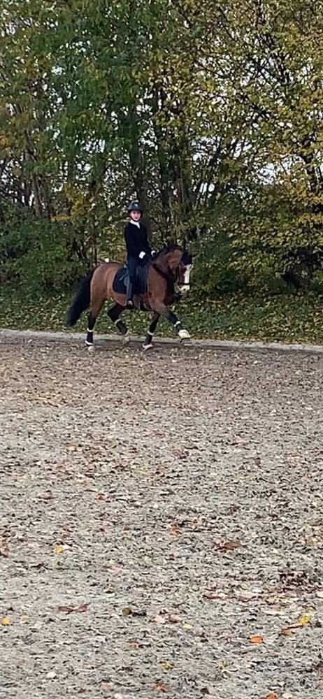 Hun har været B pony ved de sidste to ejere, og gået landsstævner. Vi har haft hende i 2,5 år, hvor fokus har været mere på dagligdagen og gode oplevelser, og ikke så meget i byen. Dog er hun meget sød og nem, at have med i byen.