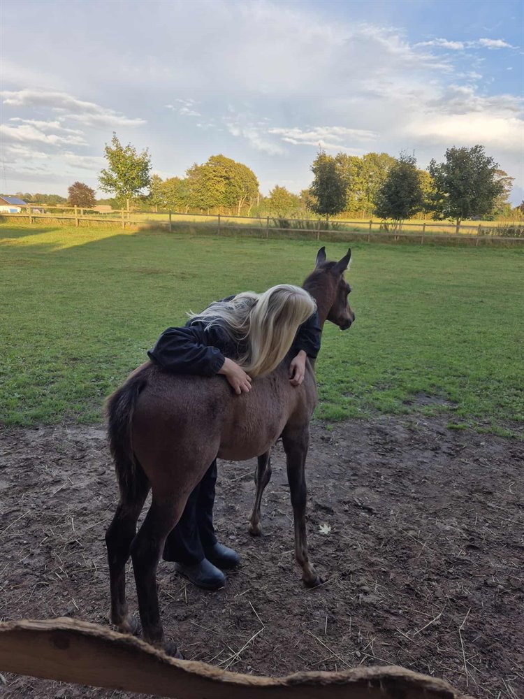 Marbush er en smuk og sød hingsteplag fra juni. Han håndteres dagligt, kan røres overalt og løfte ben.