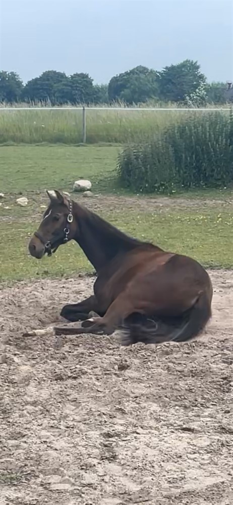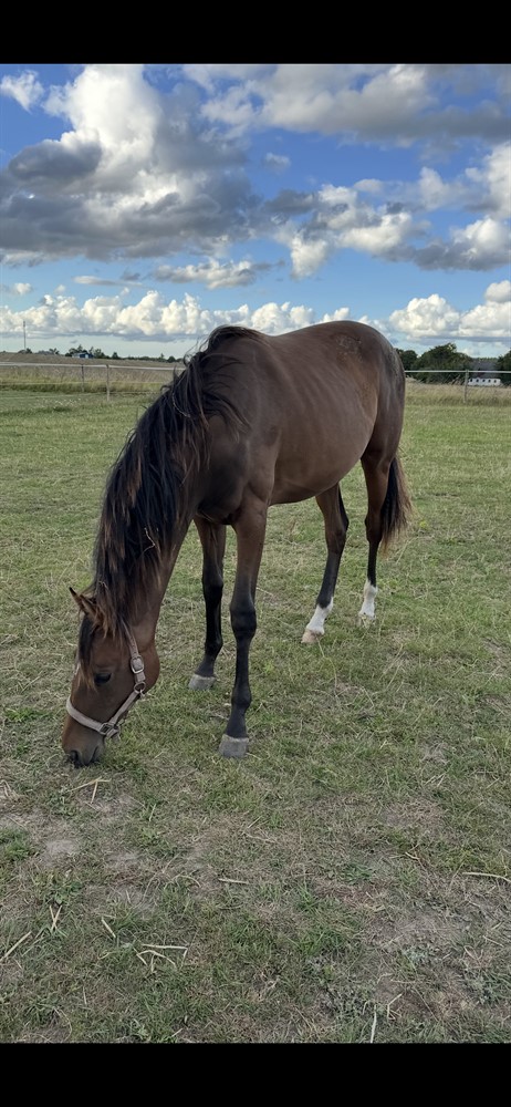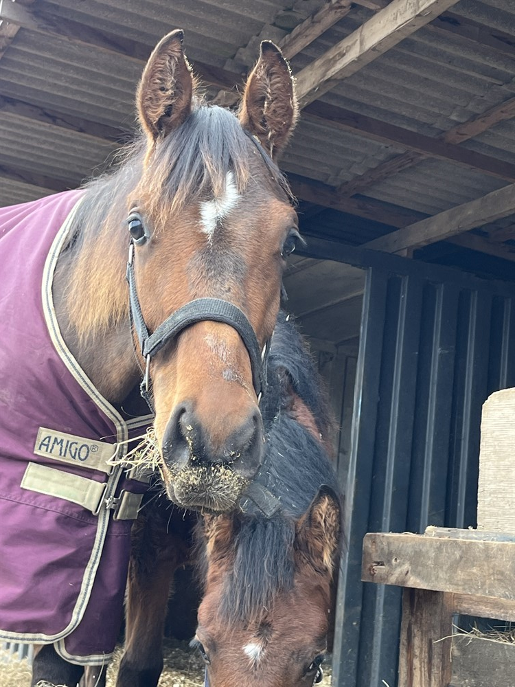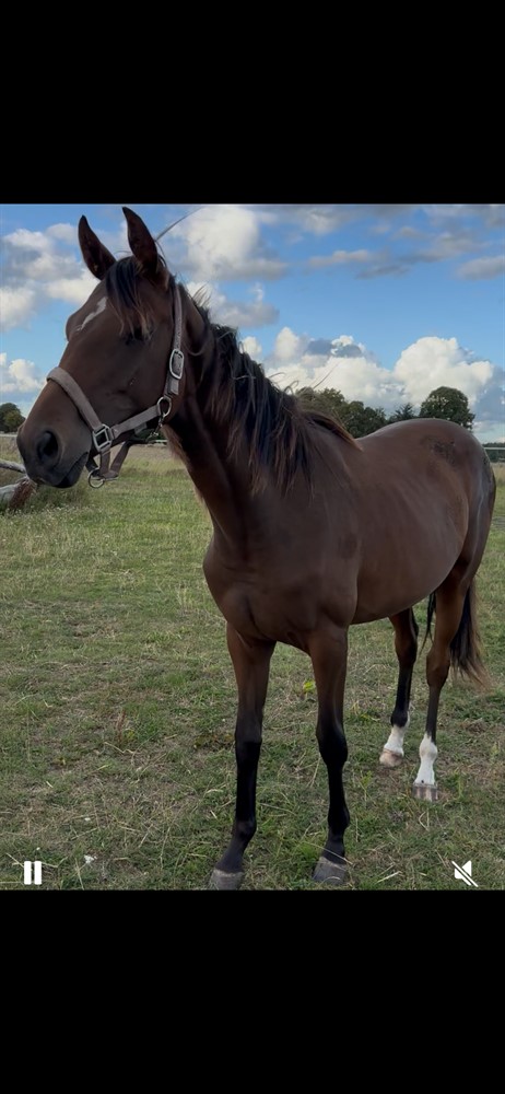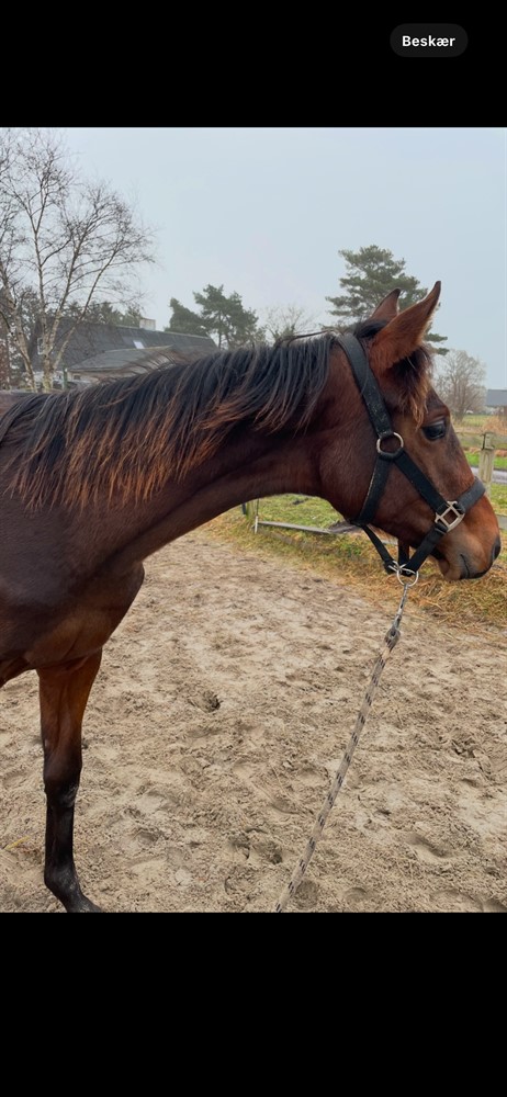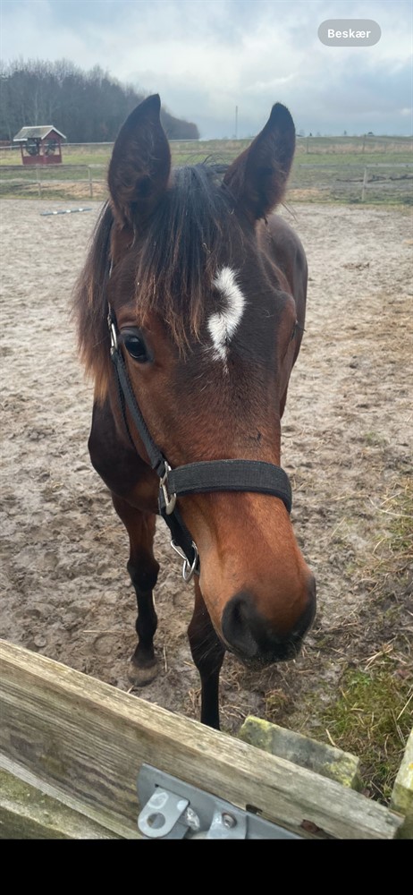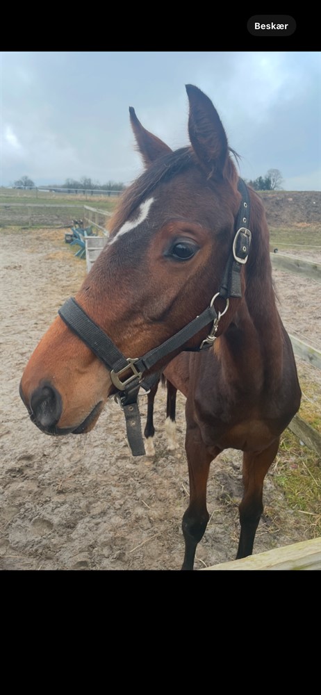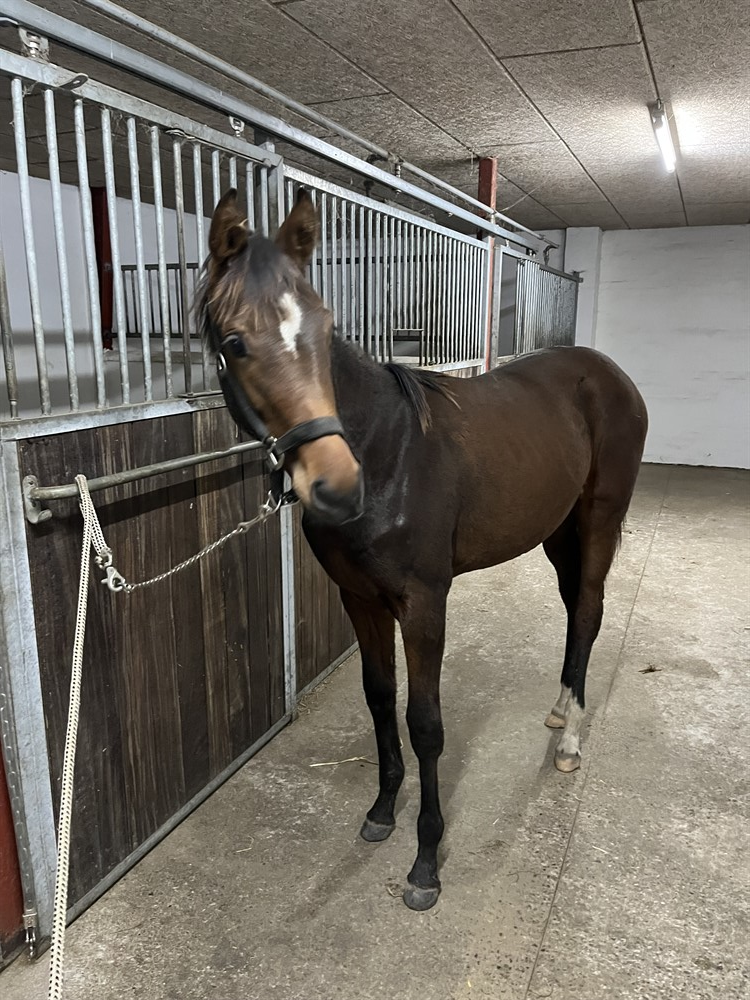 Klar til at flytte hjemmefra - og selvfølgelig gerne til et sted med jævnaldrende. Hun går i øjeblikket på fold med en anden hoppe.