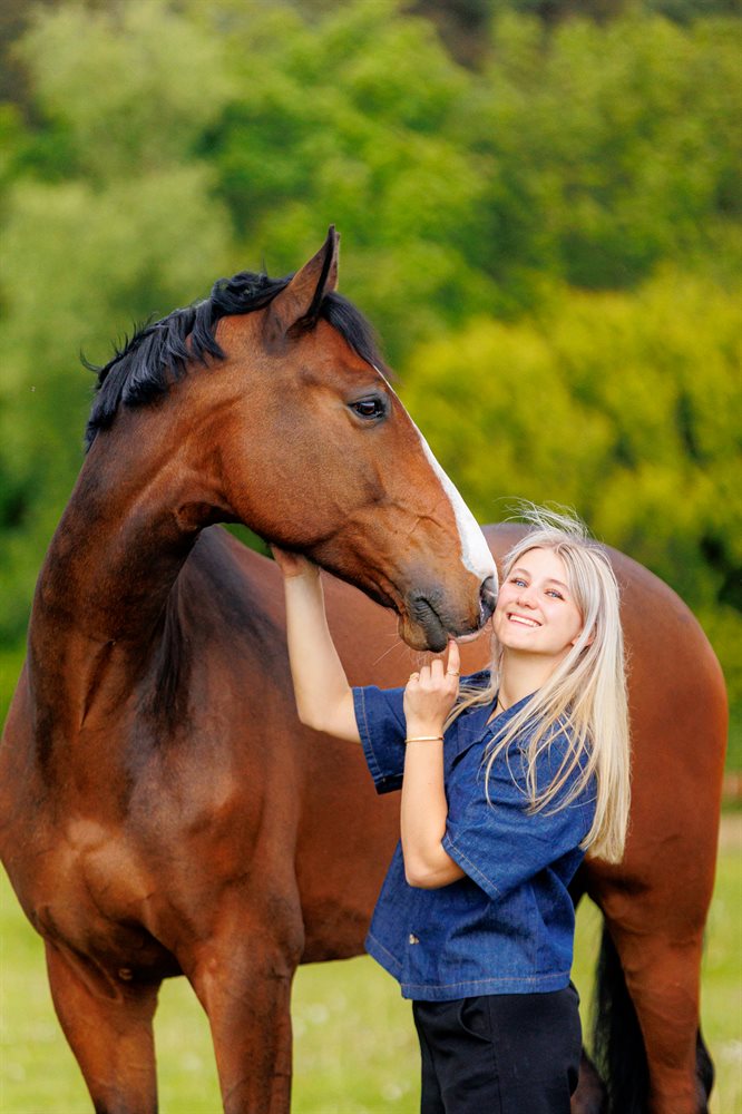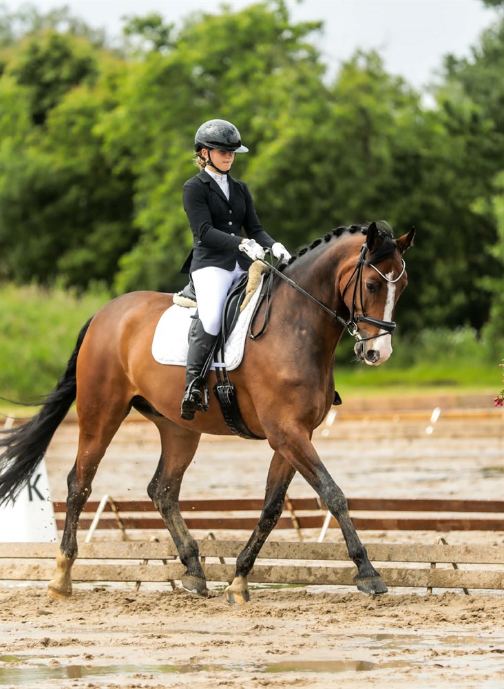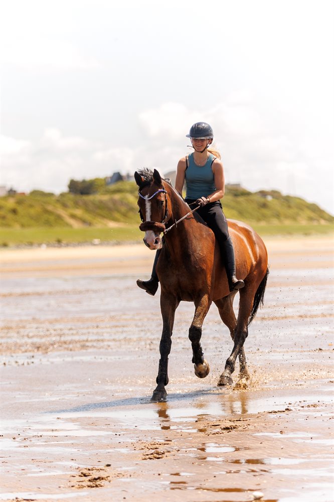 I det daglige er han let at ride og kan alle sidebevægelser. Han elsker ture i skoven og på stranden, og vi rider jævnligt både uden sadel og bidløst - han har prøvet voltigering og han kan også rides i cordeo.