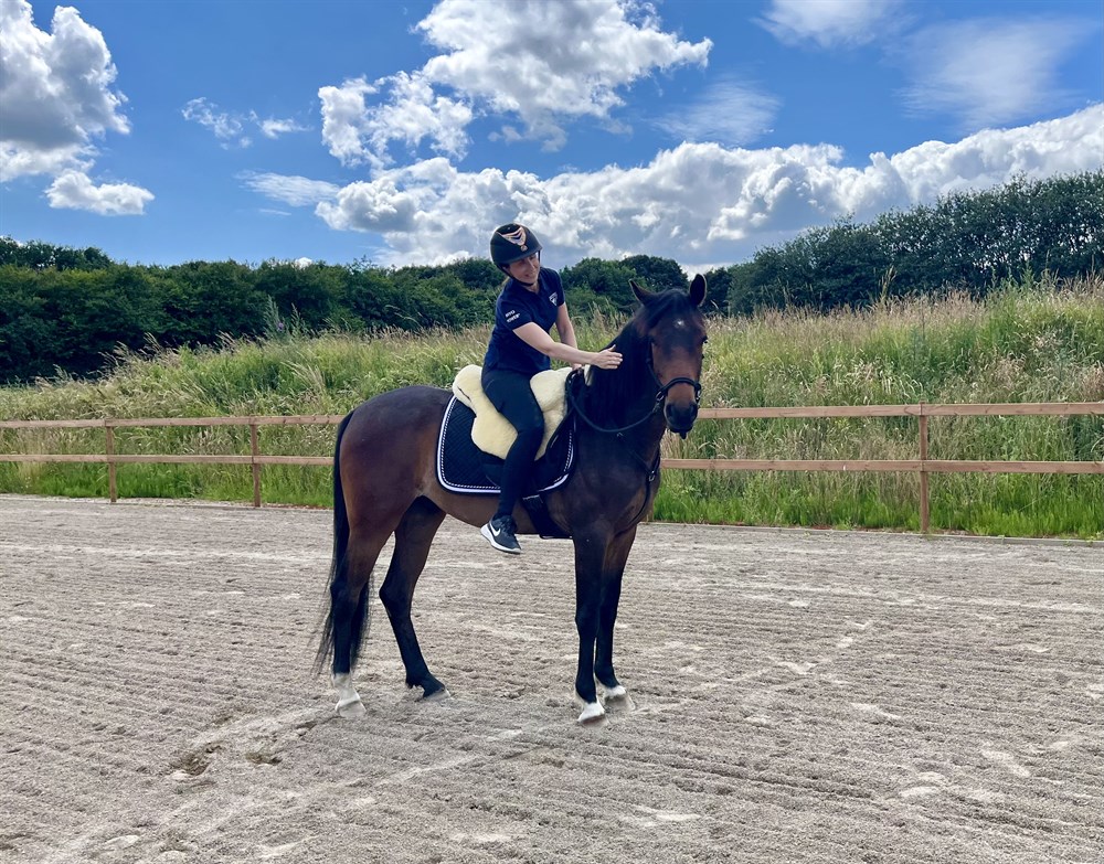 Så her langt er han redet i skridt, trav og enkelte galopper på bane, har været ude på turer i skoven og mindre veje. Kan tages ind og rides alene eller sammen med andre både på tur og bane. Han har løssprunget et par gange. Han er også trænet med jordarbejde, gå/trækturer og introduceret til klikkertræning og anden træning med positiv forstærkning.