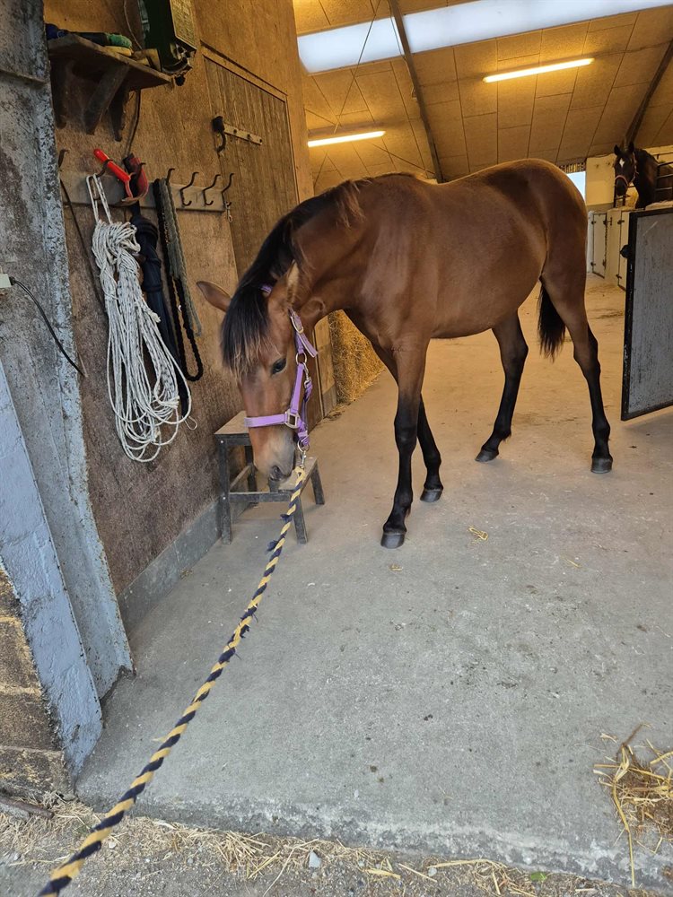 Vaya kan stå bundet alene i stalden, kan trækkes ind og ud alene, gå ture. Hun er passet med smed og vacciner.