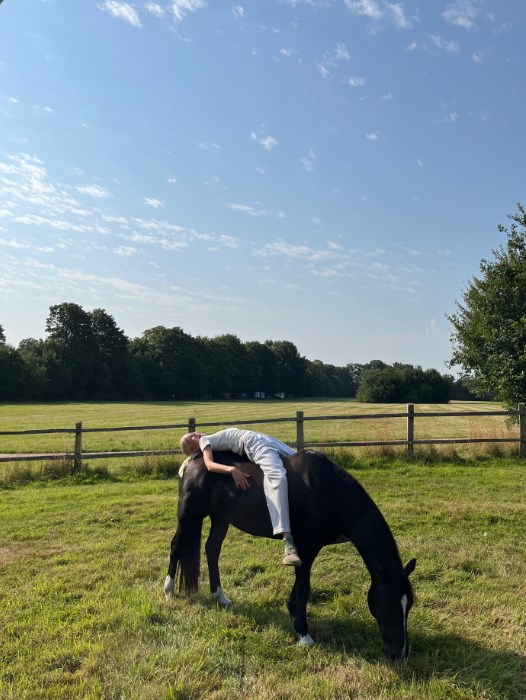 Ringo trives bedst med varieret ridning, hvor vi også har lavet longering, miljøtræning og bomarbejde.